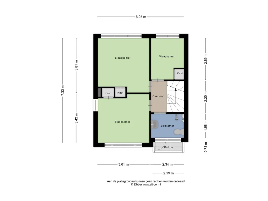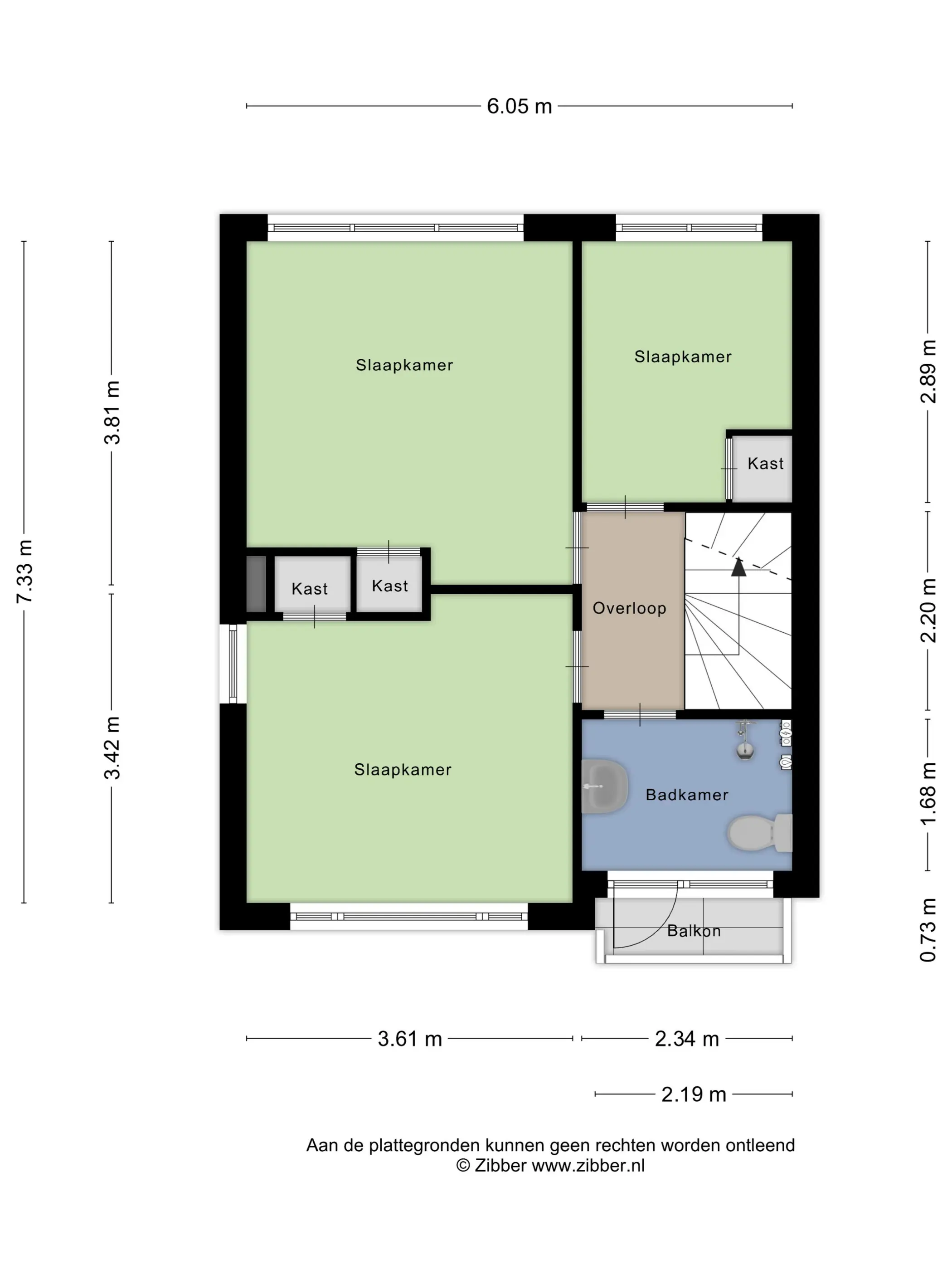 Op de eerste verdieping bevinden zich drie slaapkamers. De kamers zijn functioneel en momenteel voorzien van inbouwkasten. De badkamer is praktisch ingericht met een toilet, douche en wastafel en is toe aan vernieuwing. Vanuit de badkamer is er toegang tot het balkon, gelegen op het zuidoosten.