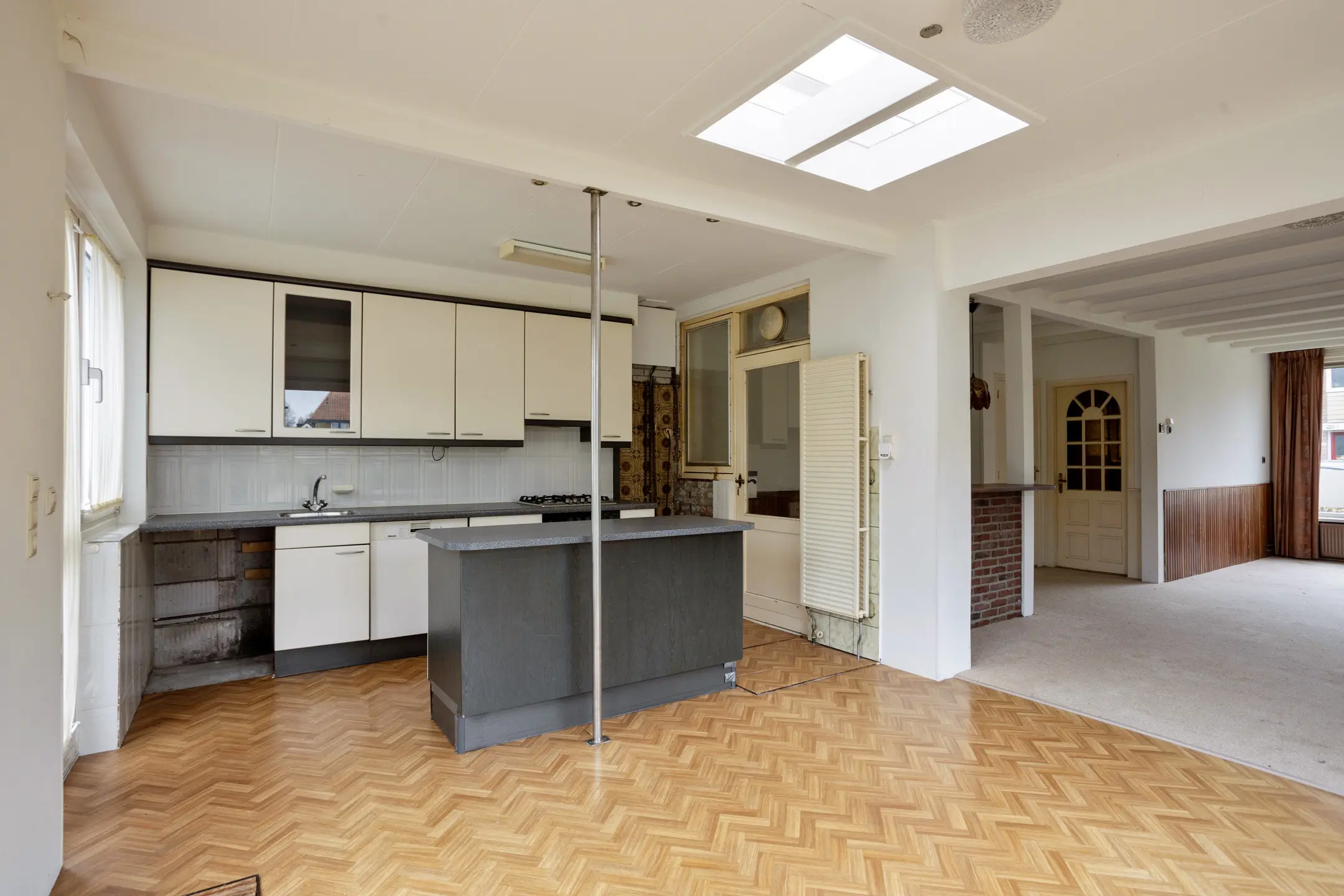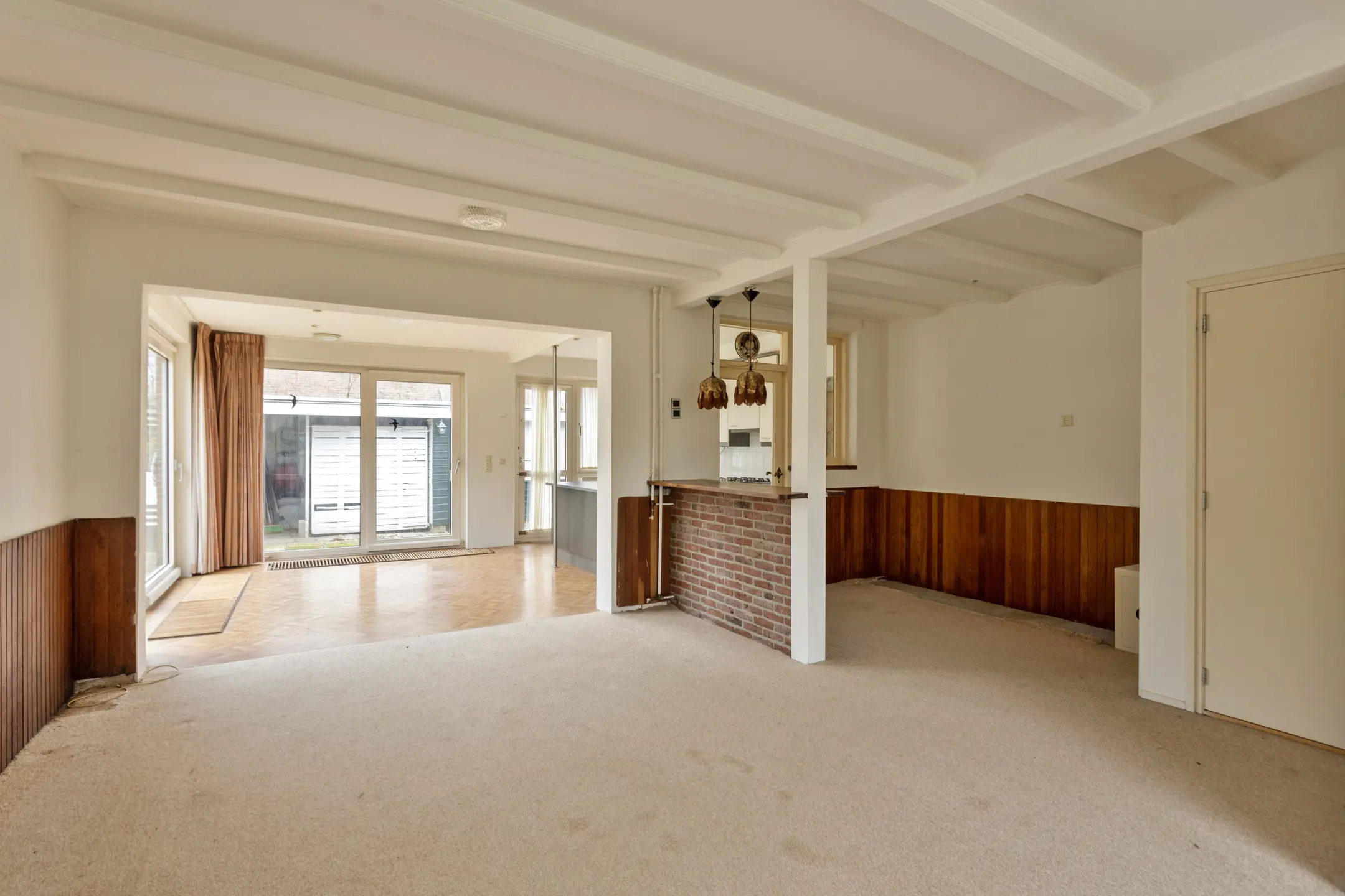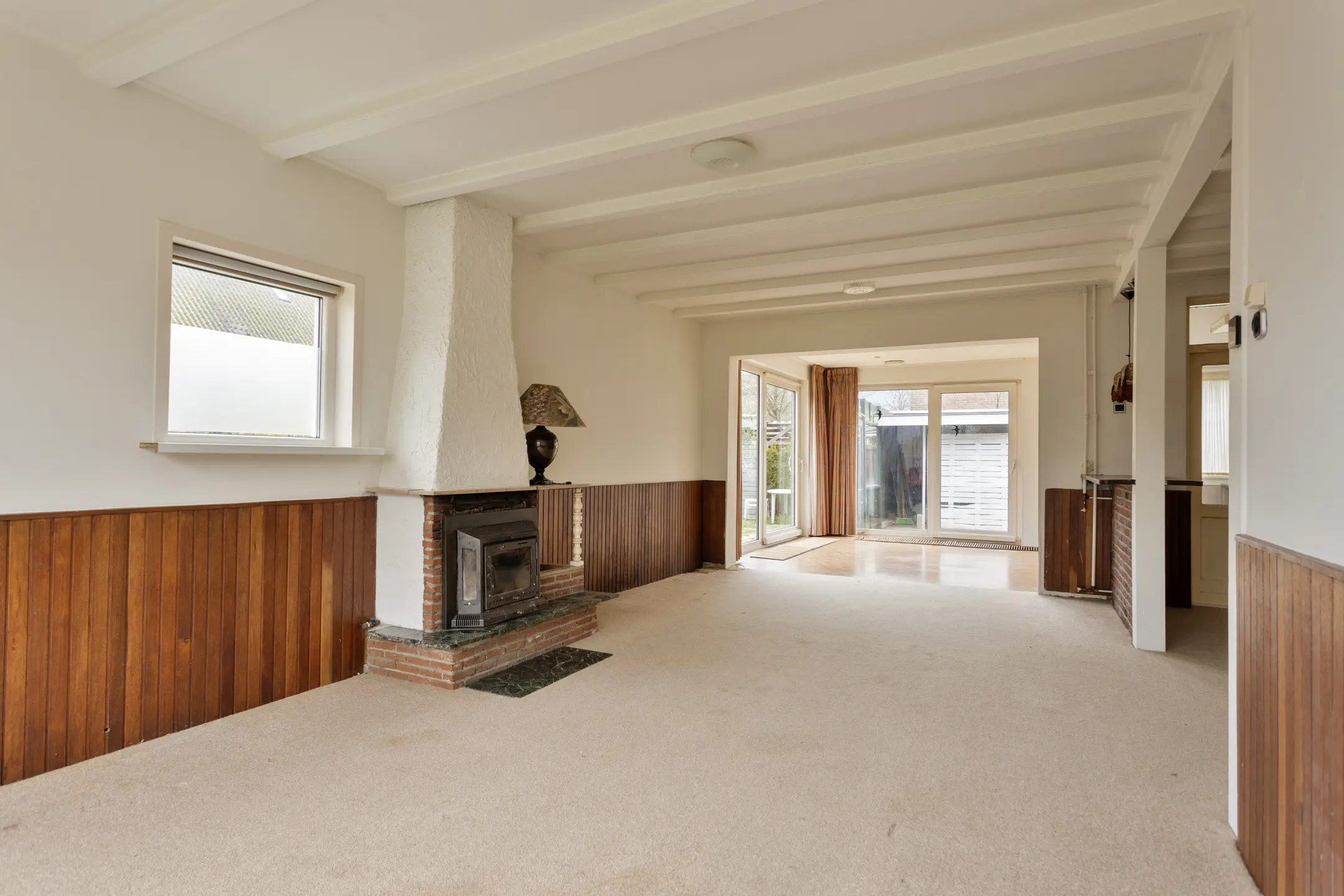 Bij binnenkomst valt direct de ruime en lichte woonkamer op. De uitbouw over de gehele breedte aan de achterzijde zorgt voor een zee van ruimte, geschikt voor een prachtige open keuken en fijne eethoek. Er zijn twee schuifpuien aanwezig die toegang verschaffen tot de achter- en zijtuin. Dit draagt bij aan het gevoel van ruimte en tevens is hierdoor de aansluiting met het buitenleven optimaal. De woonkamer biedt voldoende plek voor een royale zithoek en vormt een prettige basis voor een modernisering naar eigen wens, al dan niet met een openhaard.