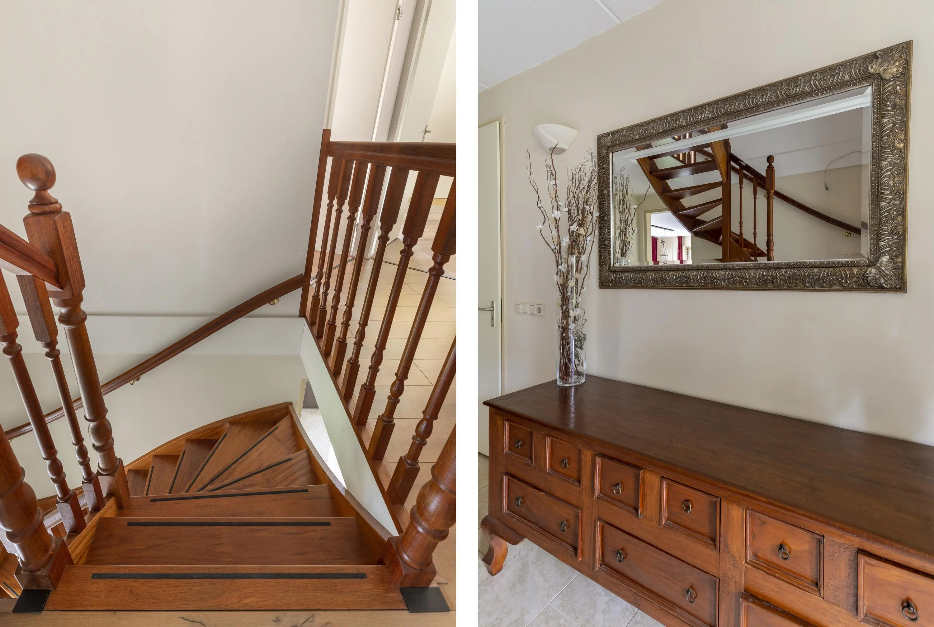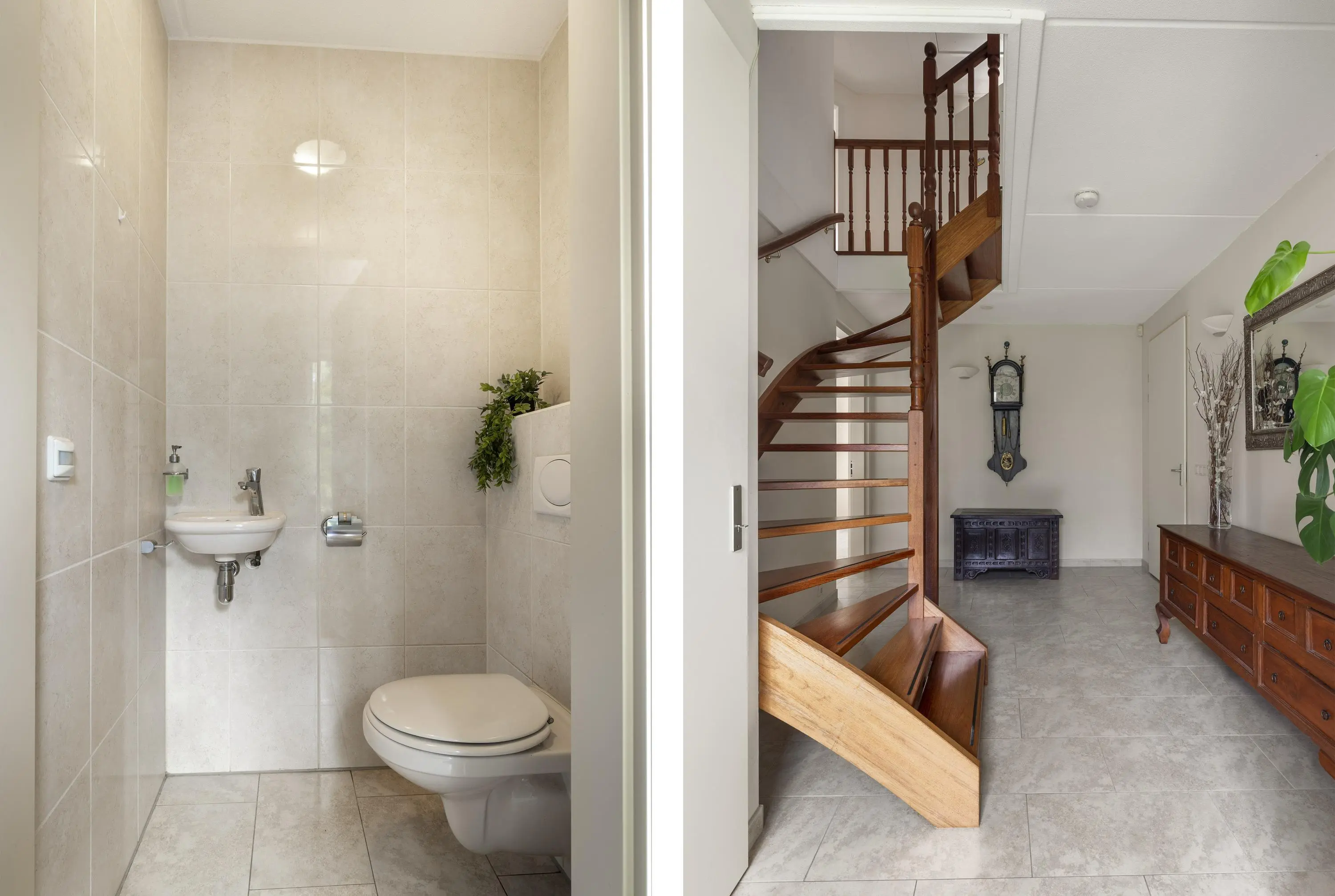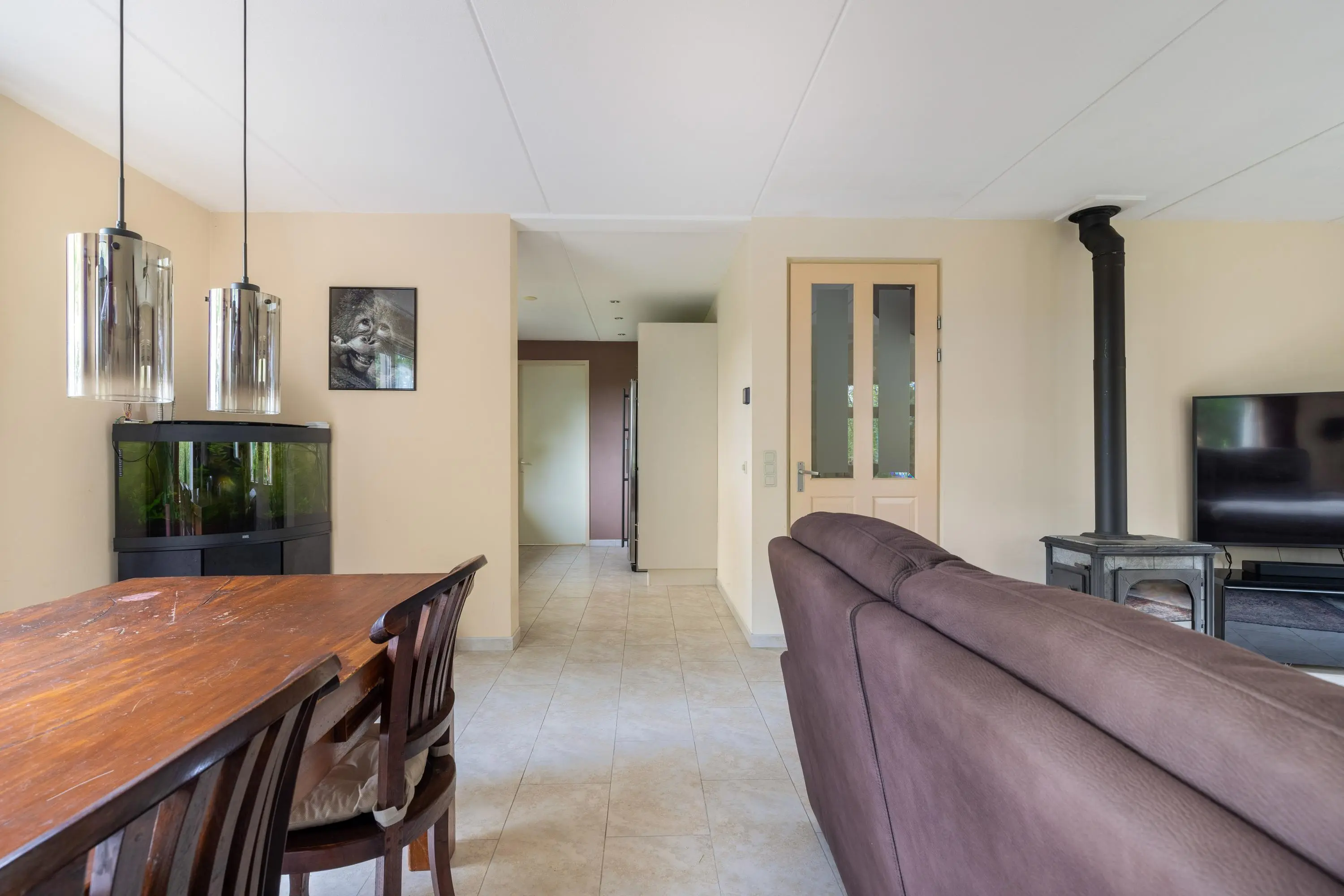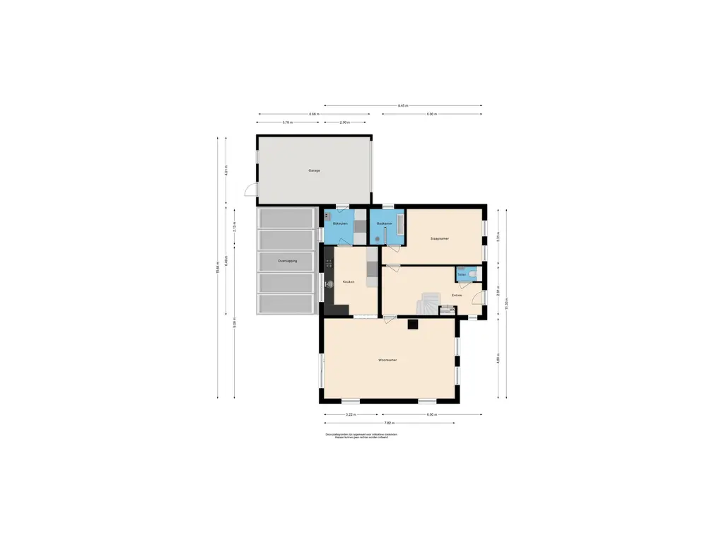 Bij aankomst valt direct de ruime oprit op, met plaats voor meerdere auto’s en de praktische garage. Hoewel in de huidige situatie voornamelijk de achterdeur als hoofdentree wordt gebruikt, nemen we je nu mee via de voordeur. Hier stap je binnen in de hal met het toilet, de meterkast, trapopgang en toegang tot de slaapkamer op de begane grond en de woonkamer.