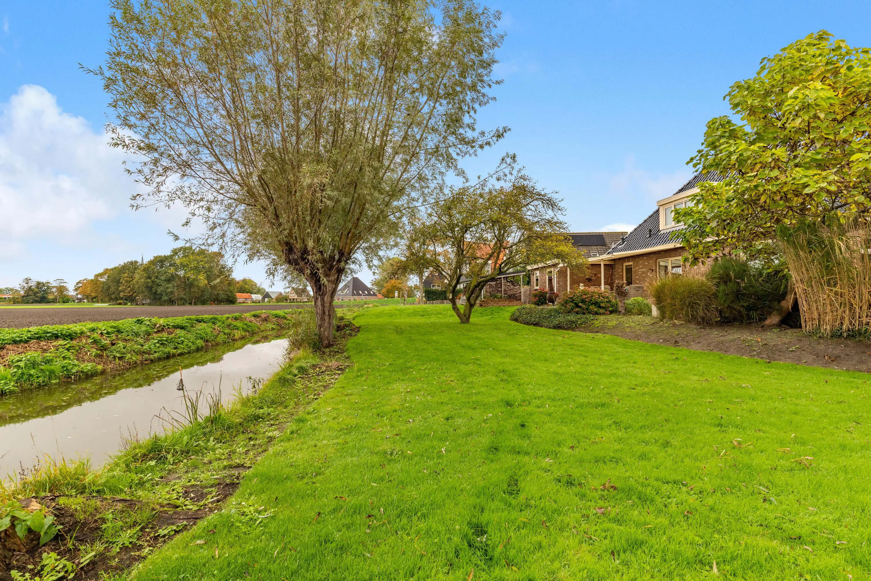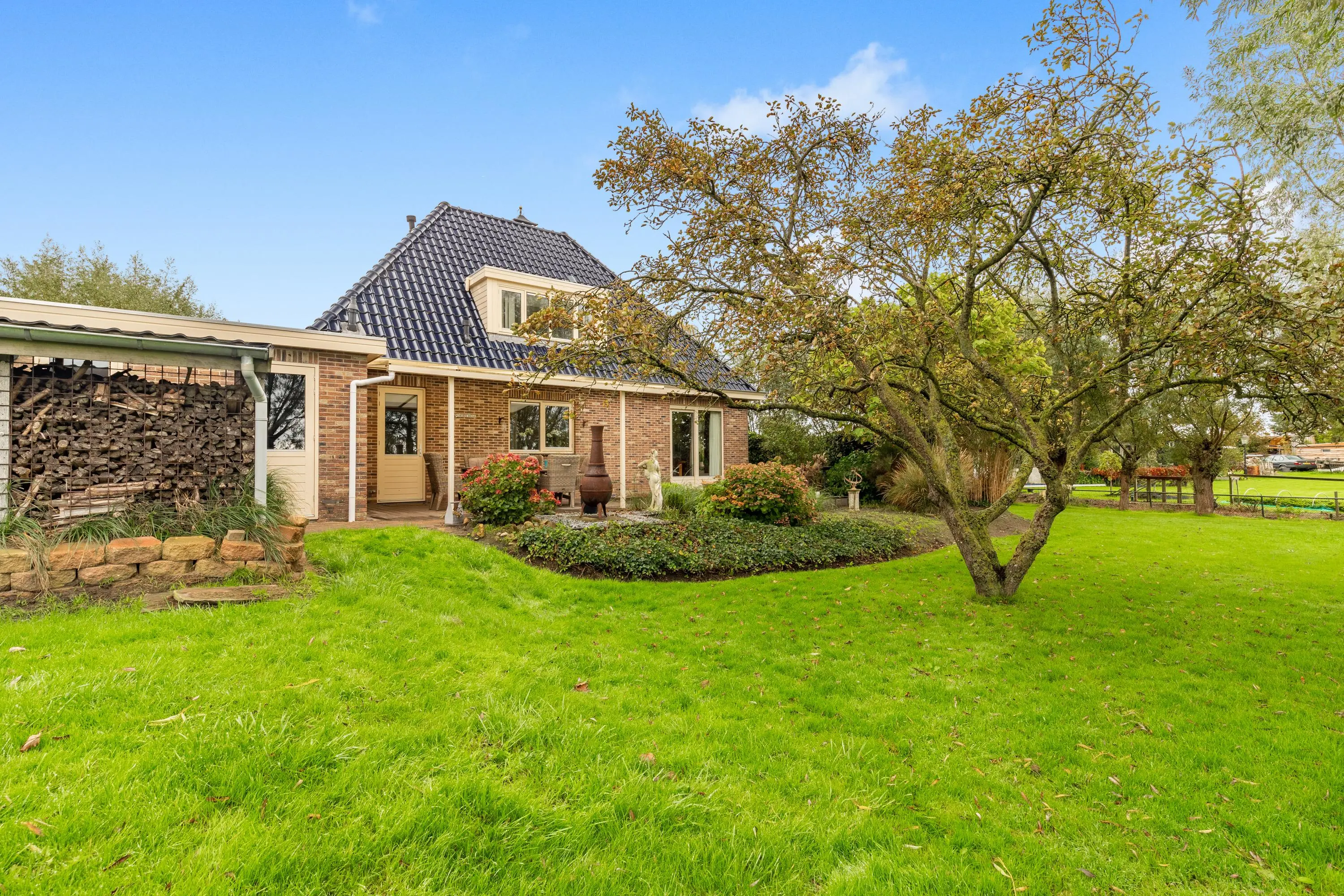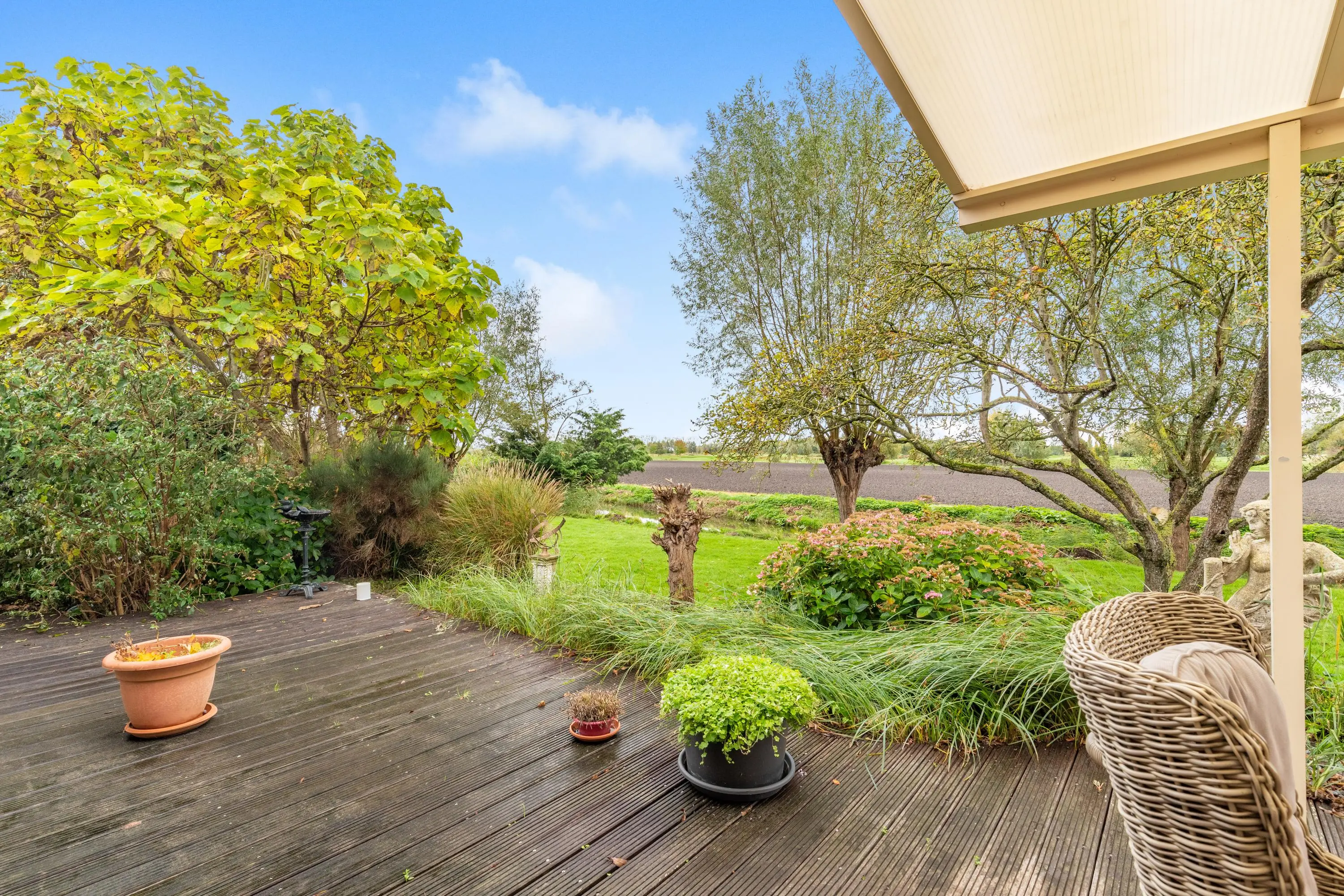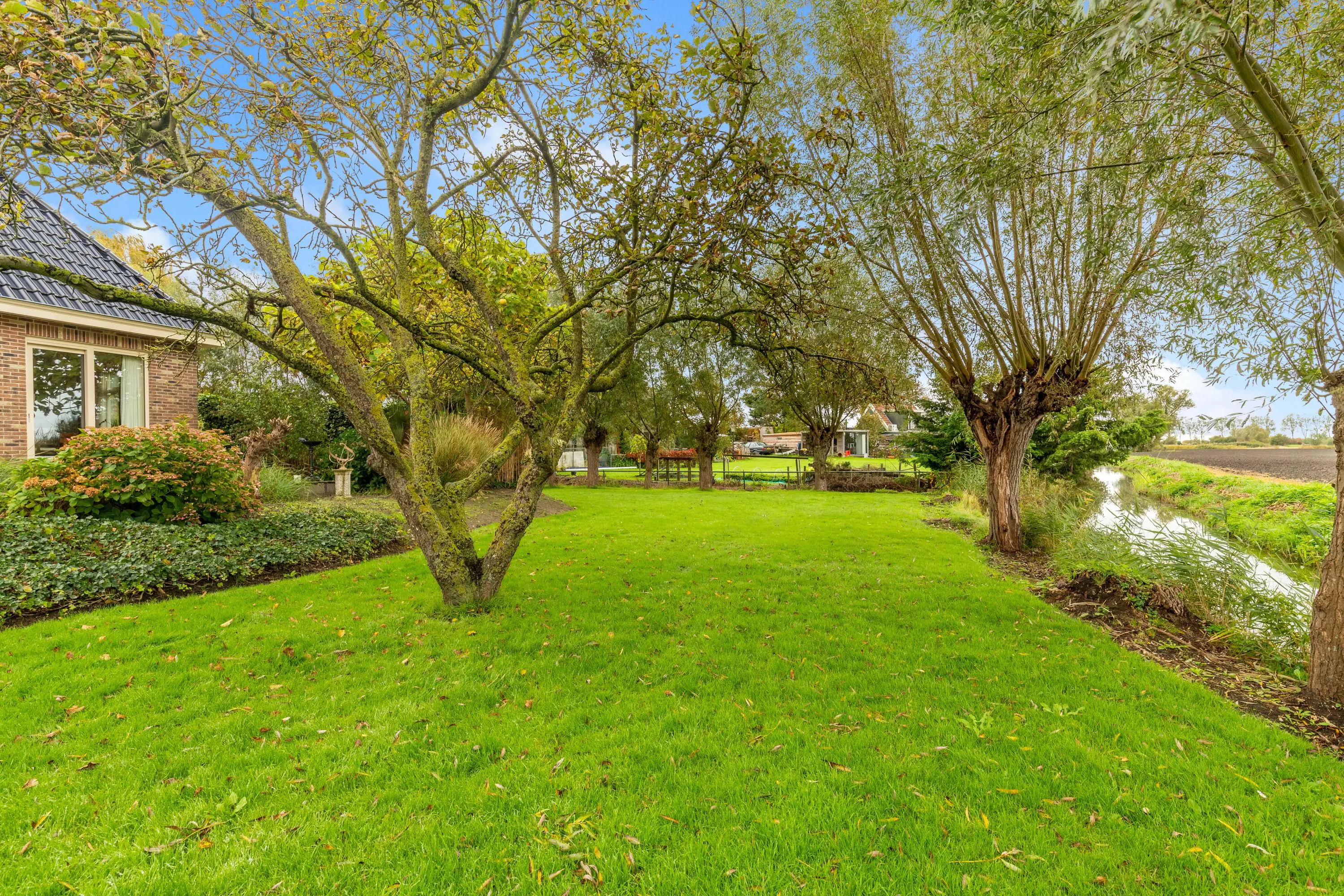 Buiten vind je een fraai aangelegde tuin rondom met aan de achterzijde een sfeervolle overkapping, een appelboom en sierlijke knotwilgen. Hier kun je de hele dag door genieten van de zon, het uitzicht en de rust die deze unieke locatie te bieden heeft.