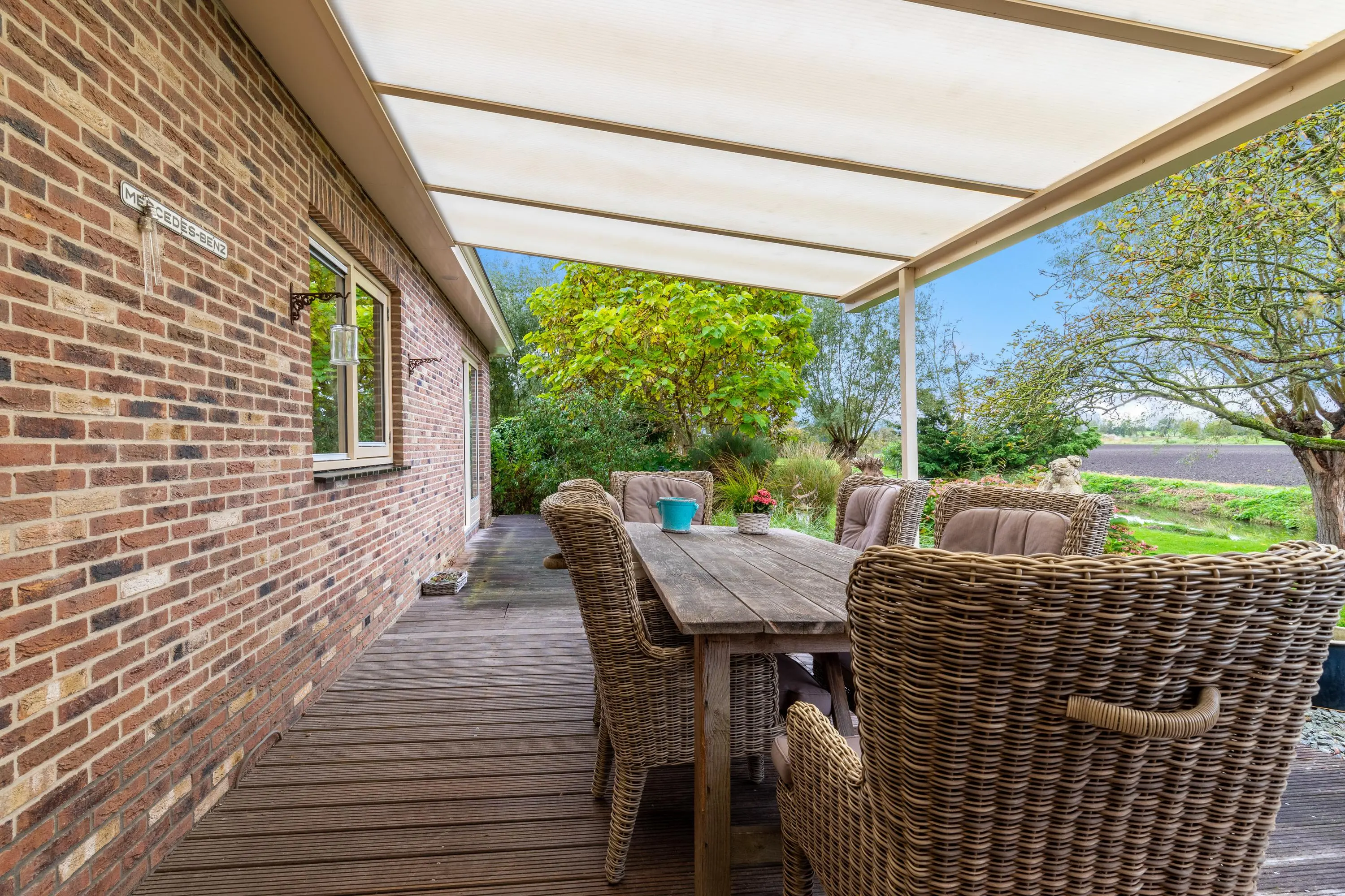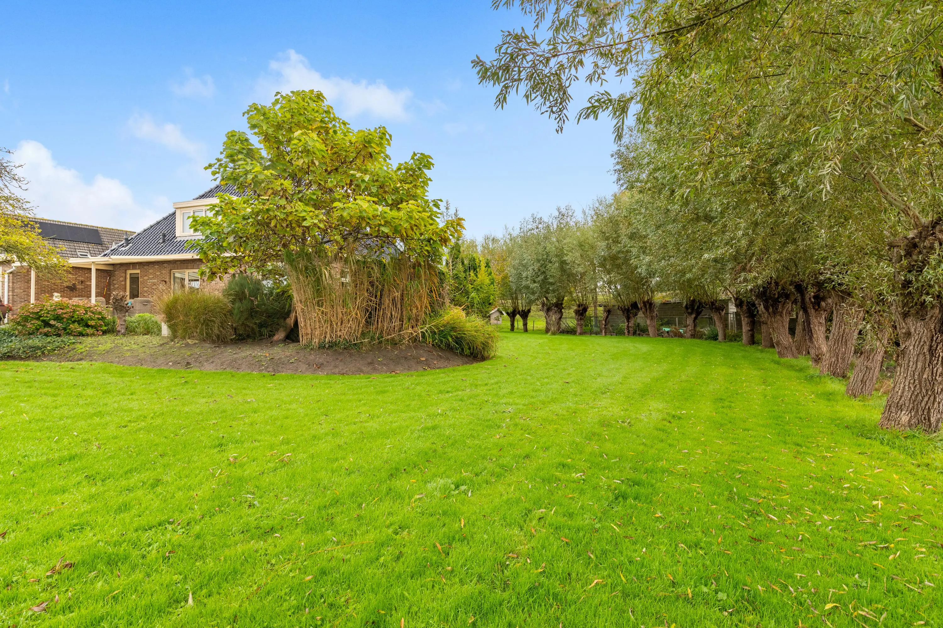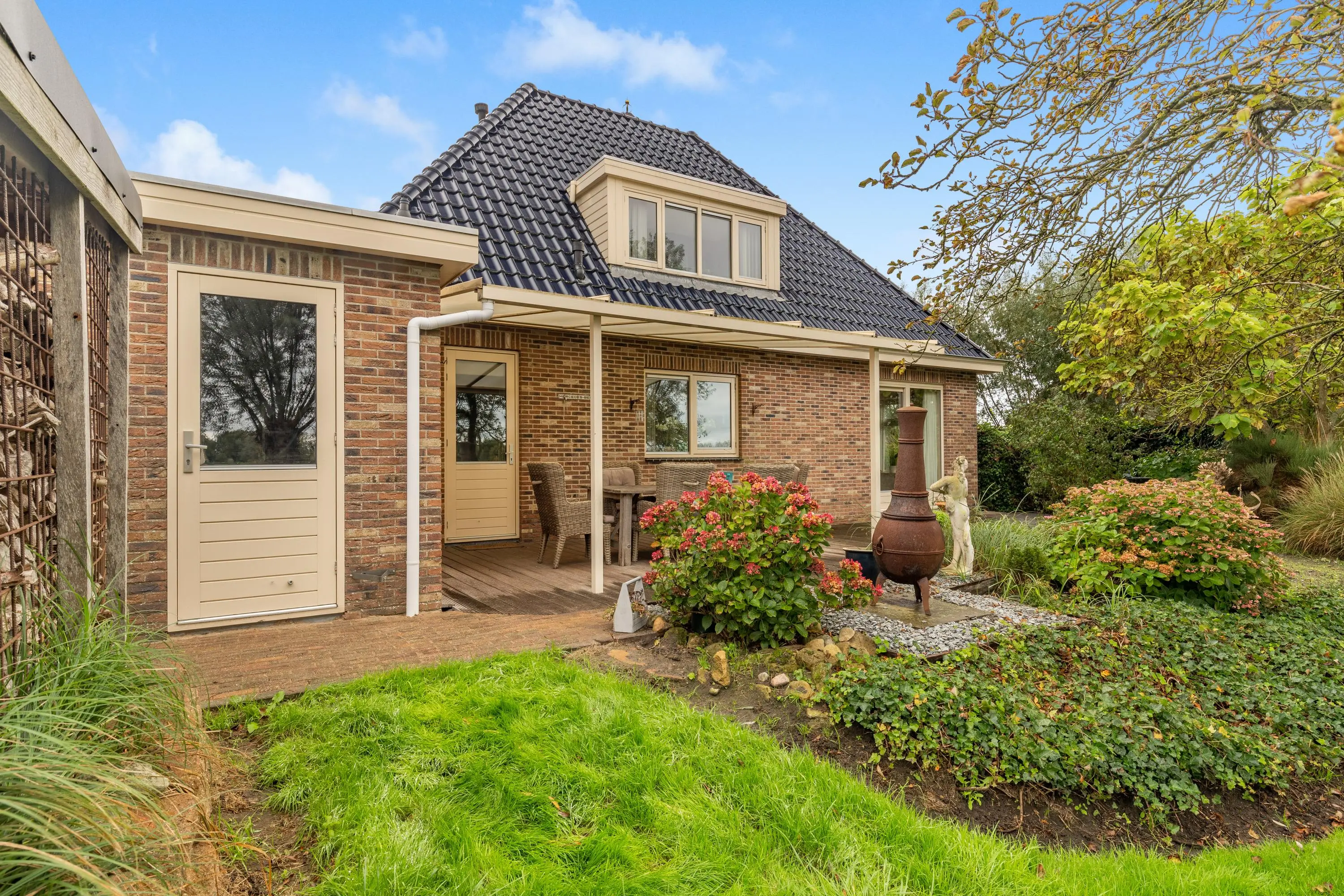 Buiten vind je een fraai aangelegde tuin rondom met aan de achterzijde een sfeervolle overkapping, een appelboom en sierlijke knotwilgen. Hier kun je de hele dag door genieten van de zon, het uitzicht en de rust die deze unieke locatie te bieden heeft.