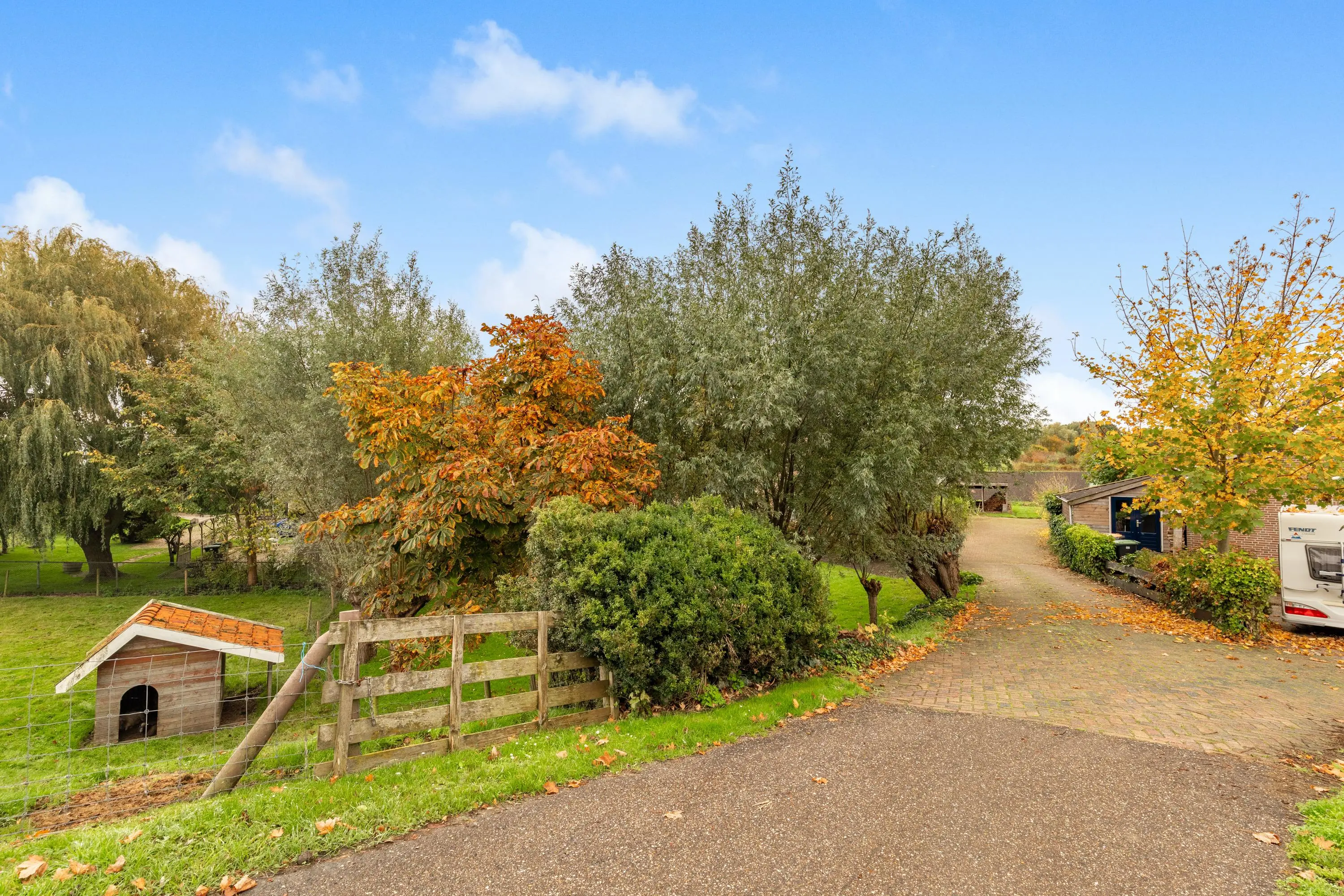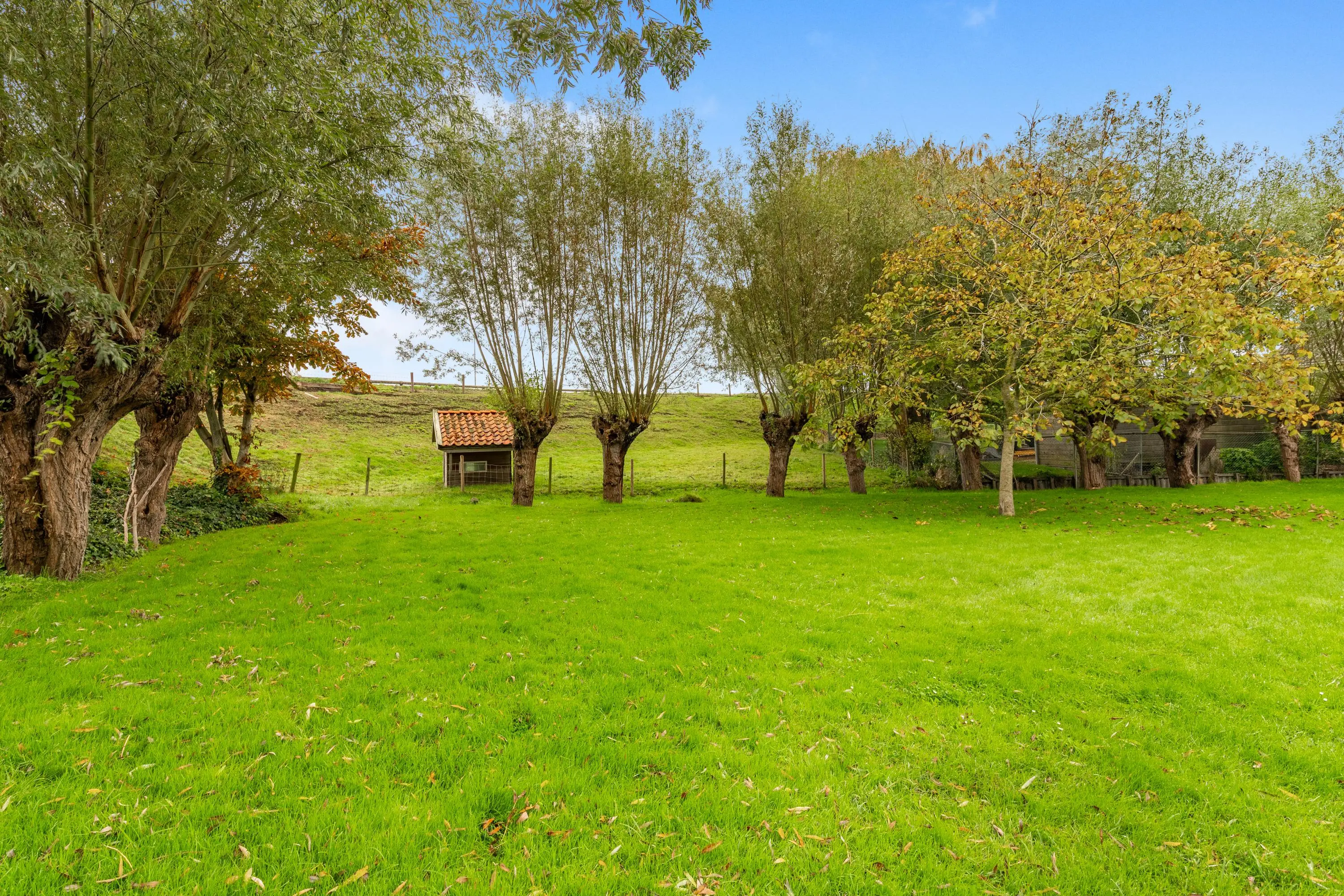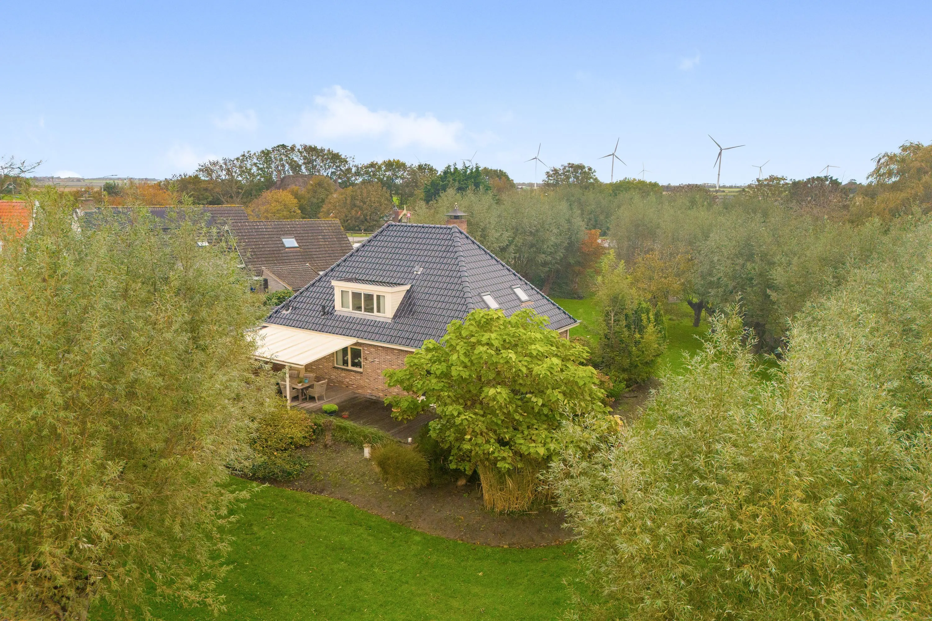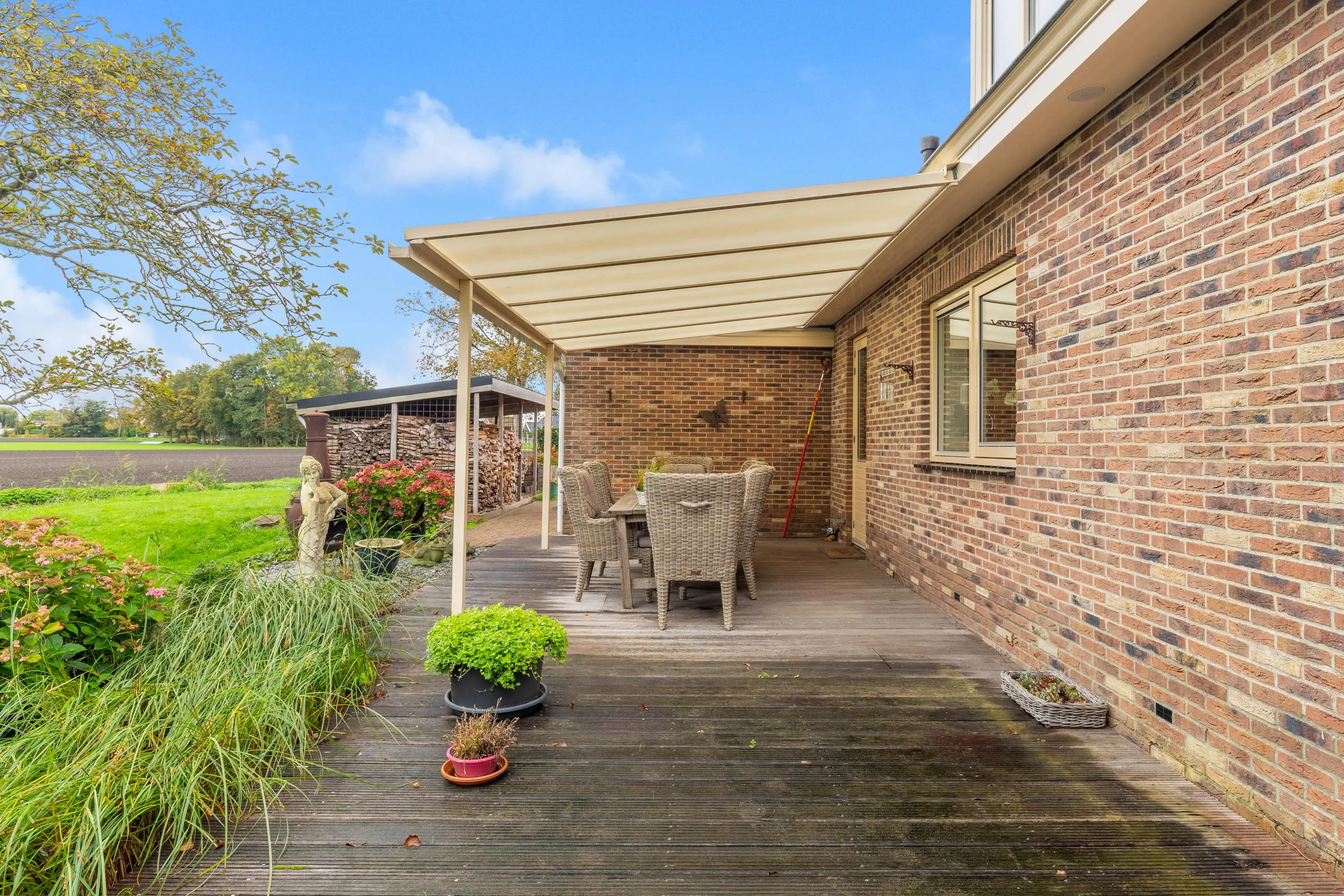 Buiten vind je een fraai aangelegde tuin rondom met aan de achterzijde een sfeervolle overkapping, een appelboom en sierlijke knotwilgen. Hier kun je de hele dag door genieten van de zon, het uitzicht en de rust die deze unieke locatie te bieden heeft.