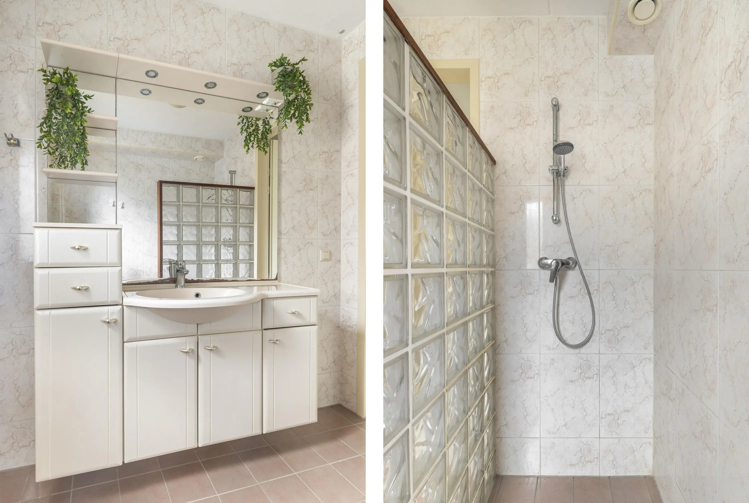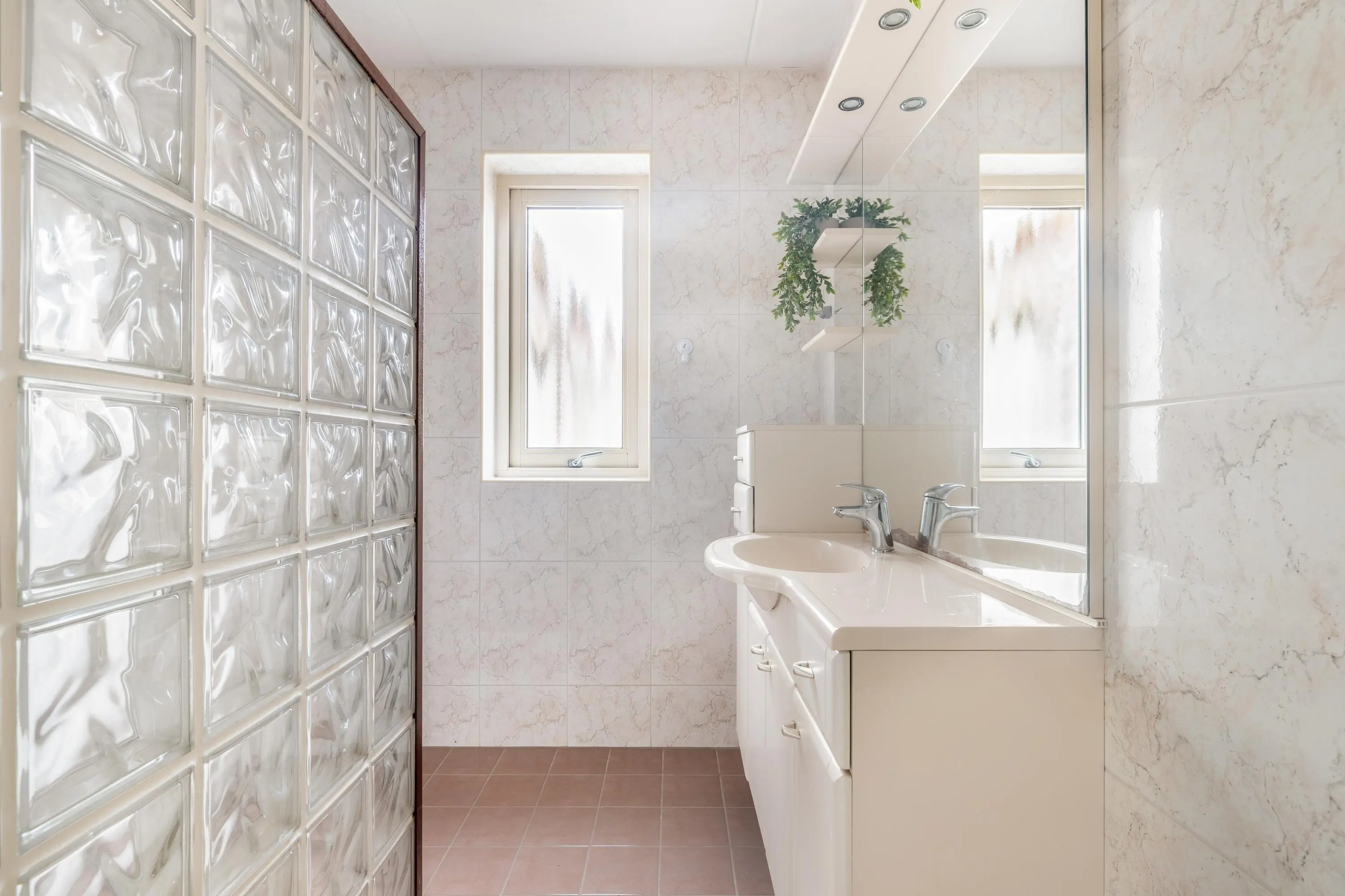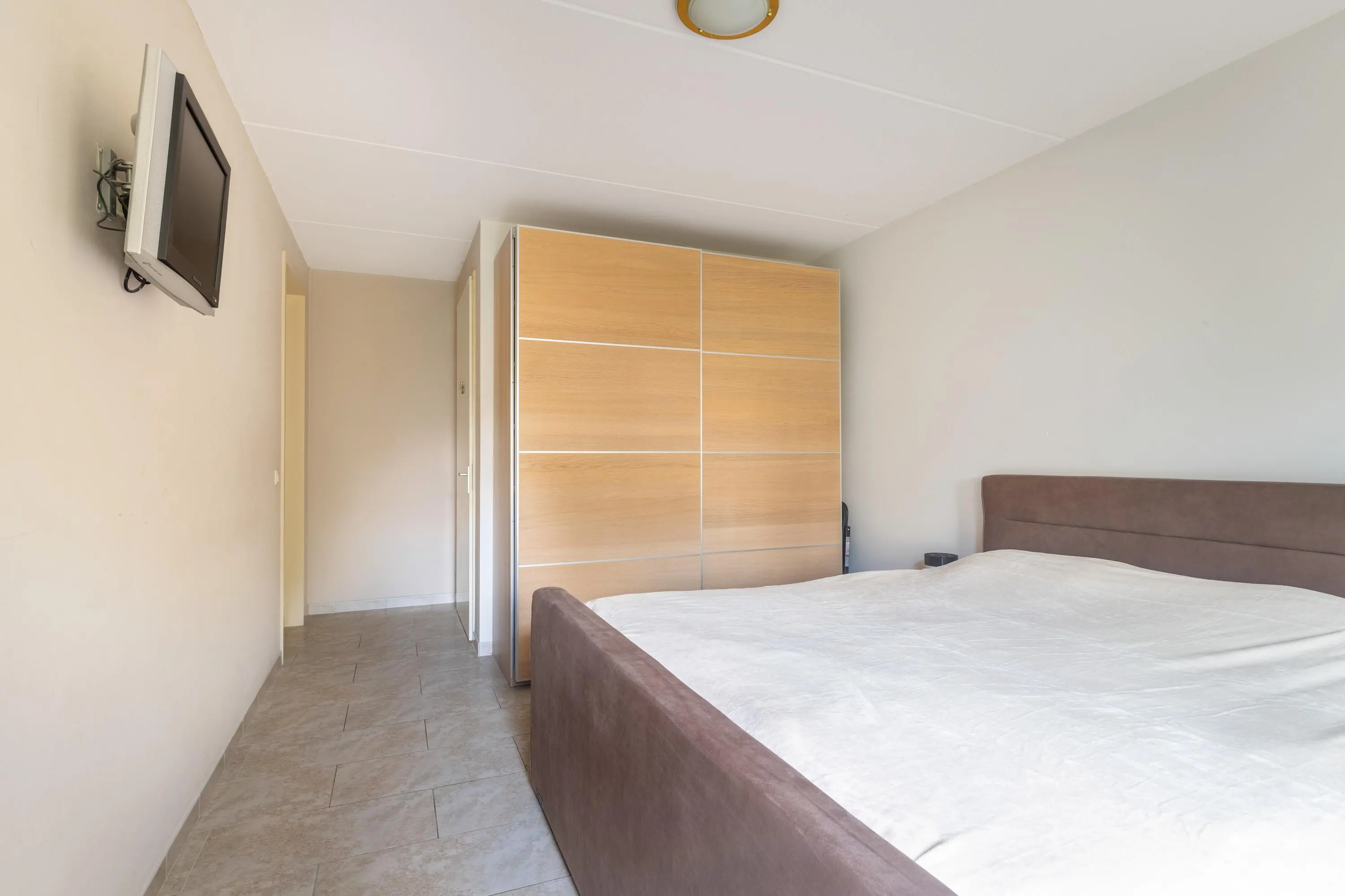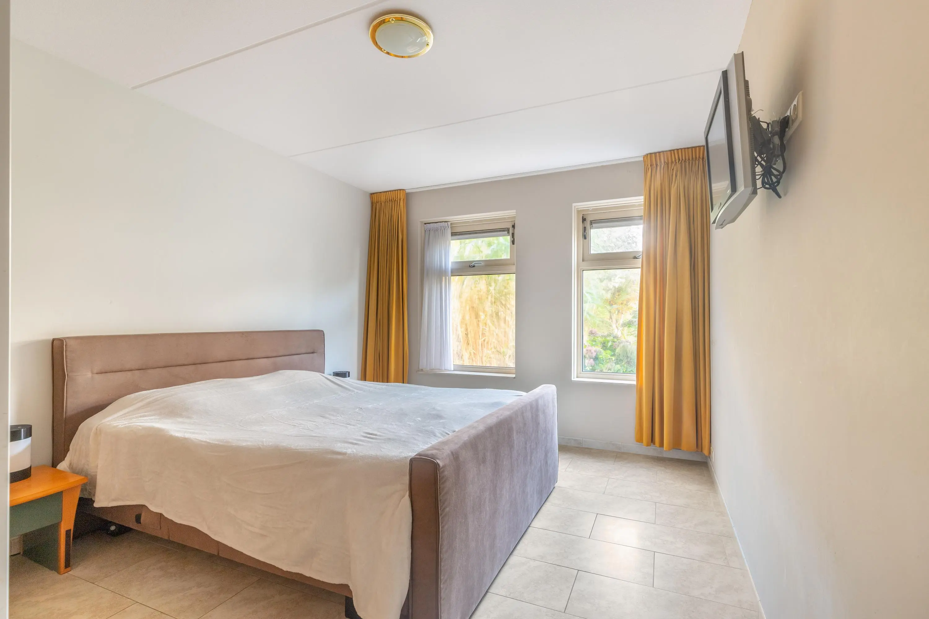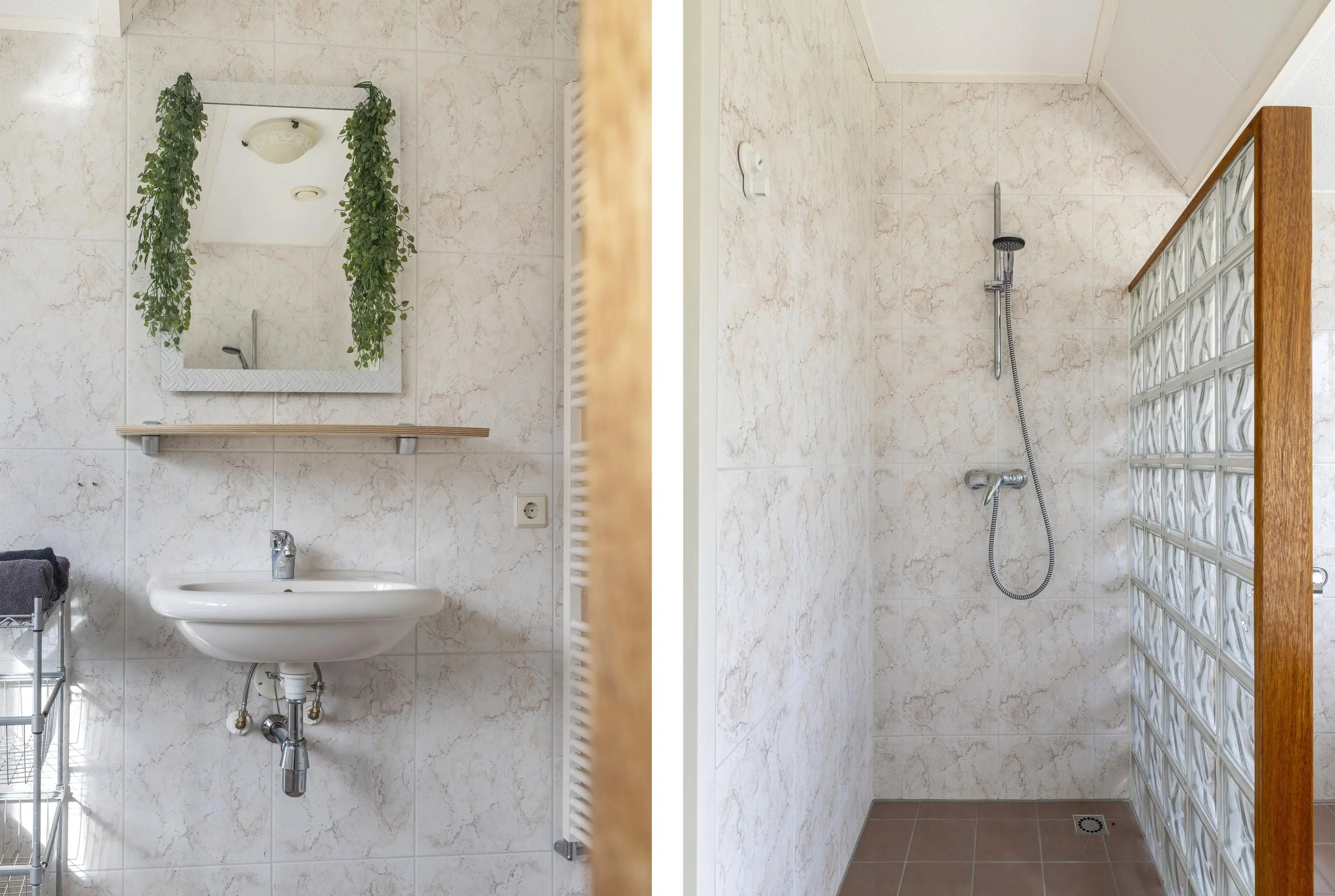 De slaapkamer op de begane grond beschikt over een aangrenzende badkamer met douche en wastafel, waardoor comfort en gemak hand in hand gaan.