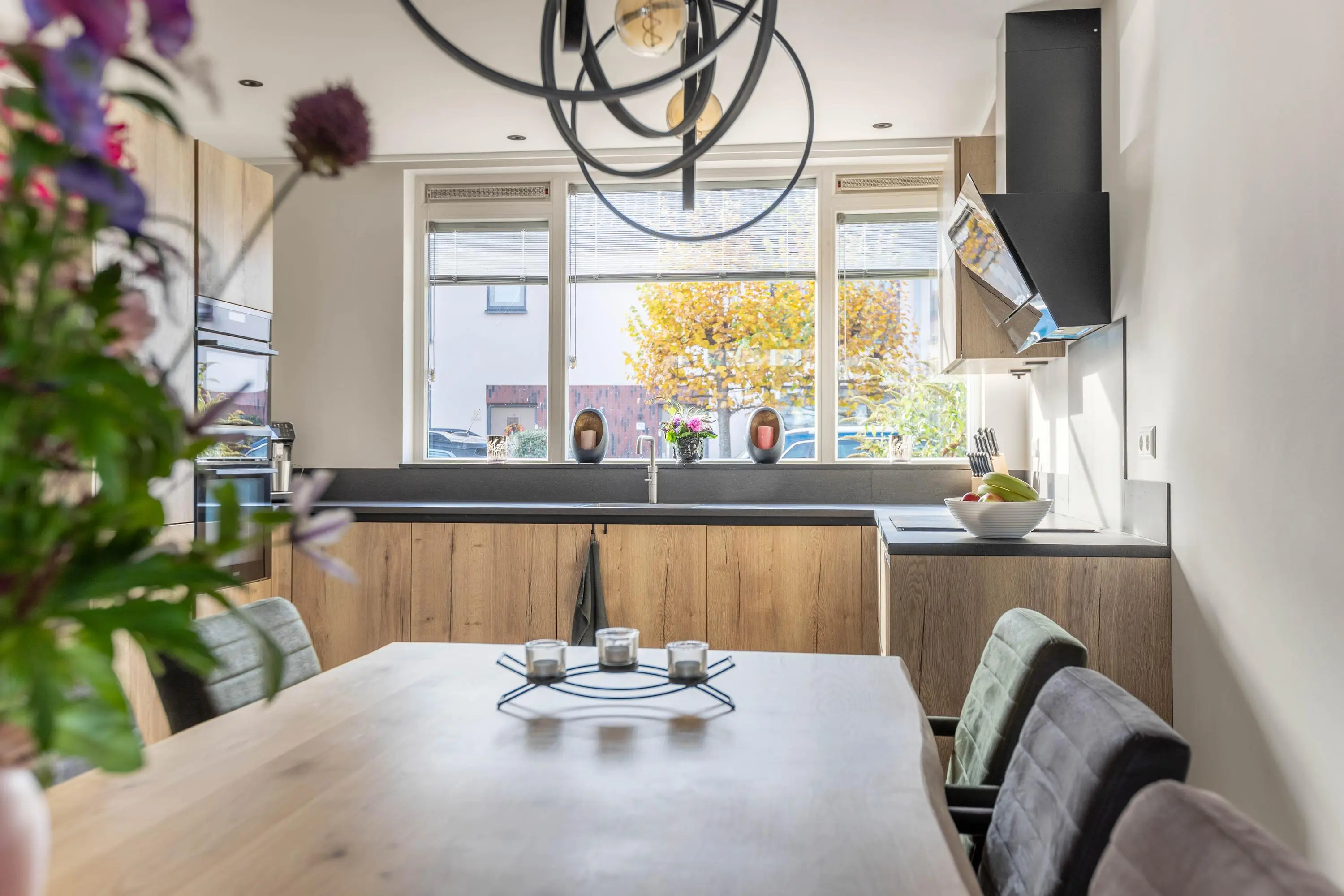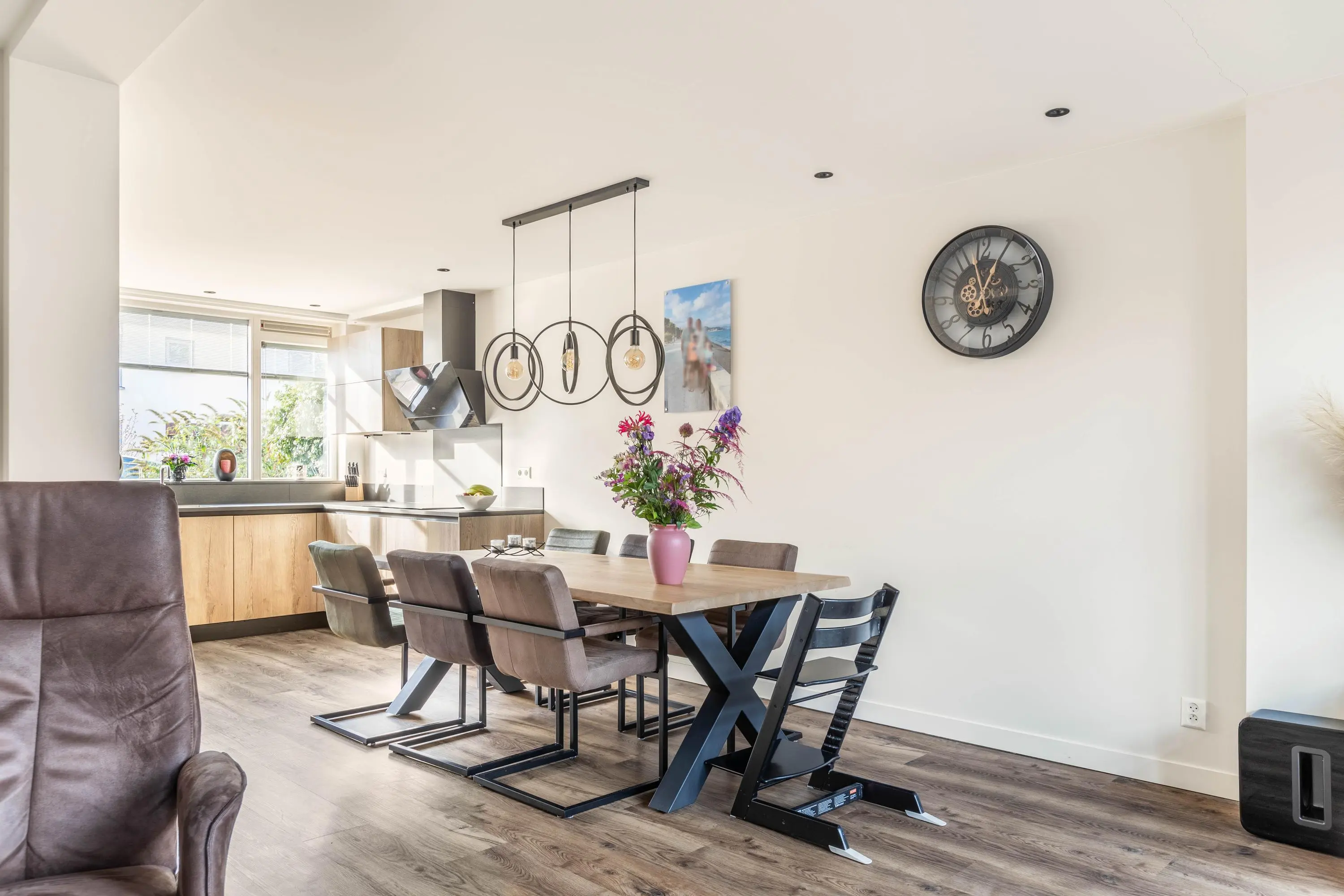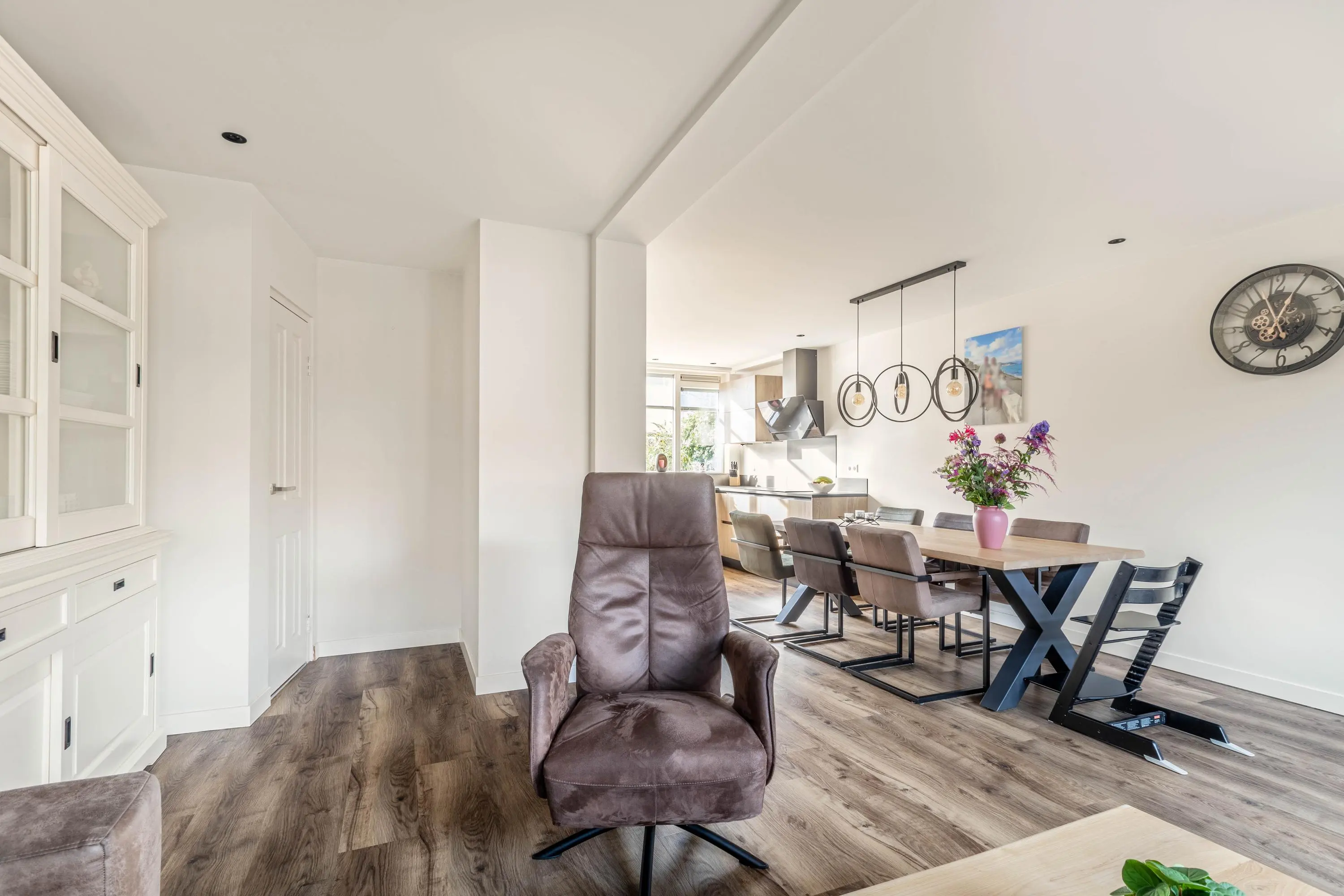 Bij binnenkomst valt direct de warme en uitnodigende sfeer op. De woonkamer is licht en ruim en biedt aan de achterzijde een knusse zithoek. De gehele begane grond is voorzien van inbouwspots, wat zorgt voor een moderne en sfeervolle uitstraling. Tussen de gezellige zithoek en moderne keuken bevindt zich de eethoek, waar je heerlijk lang kunt tafelen met vrienden en familie. De moderne open keuken is in 2023 volledig vernieuwd en vormt dankzij de ruime opzet en strakke afwerking een heerlijke plek om te koken. In de entree is tevens nog een separaat toilet aanwezig.