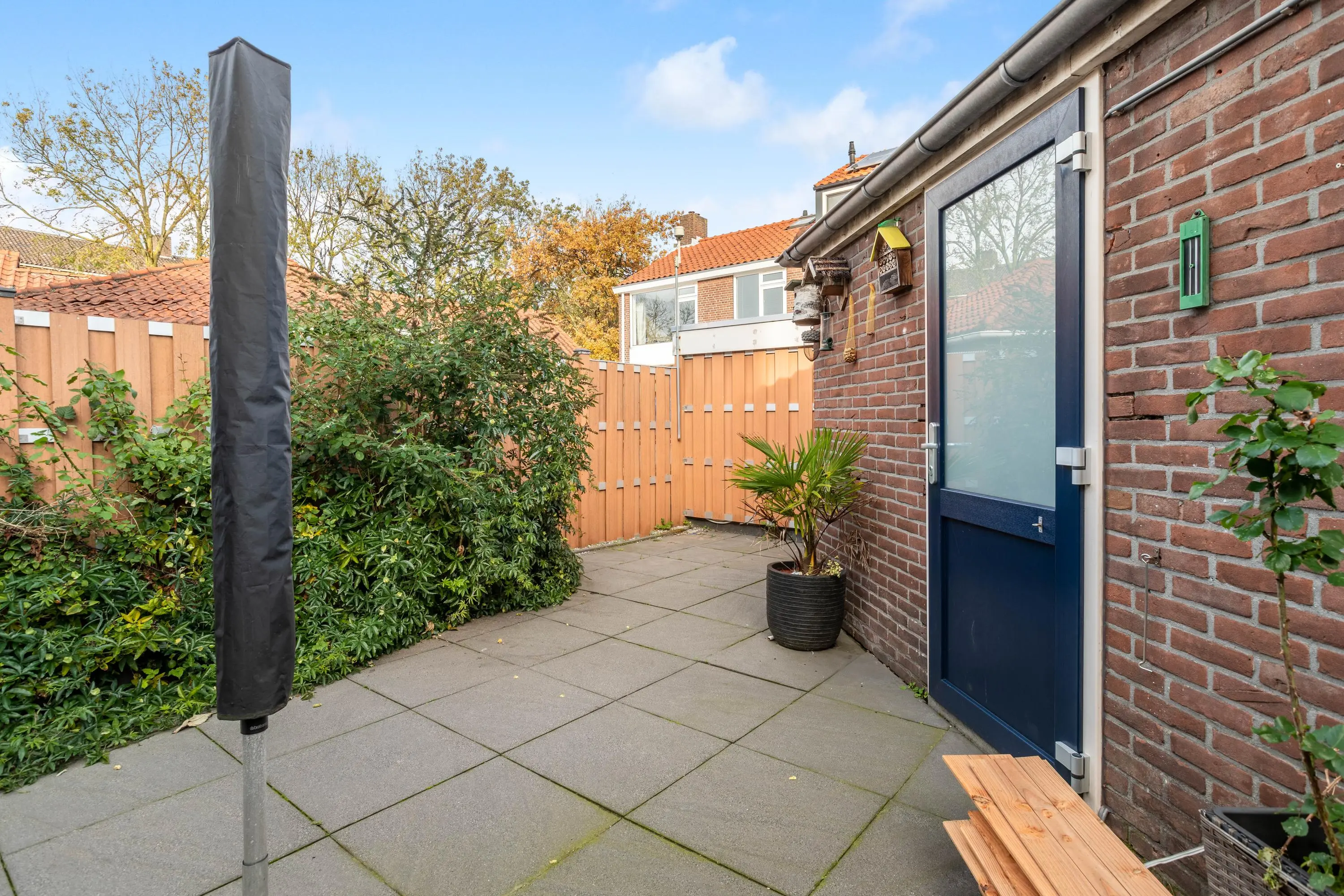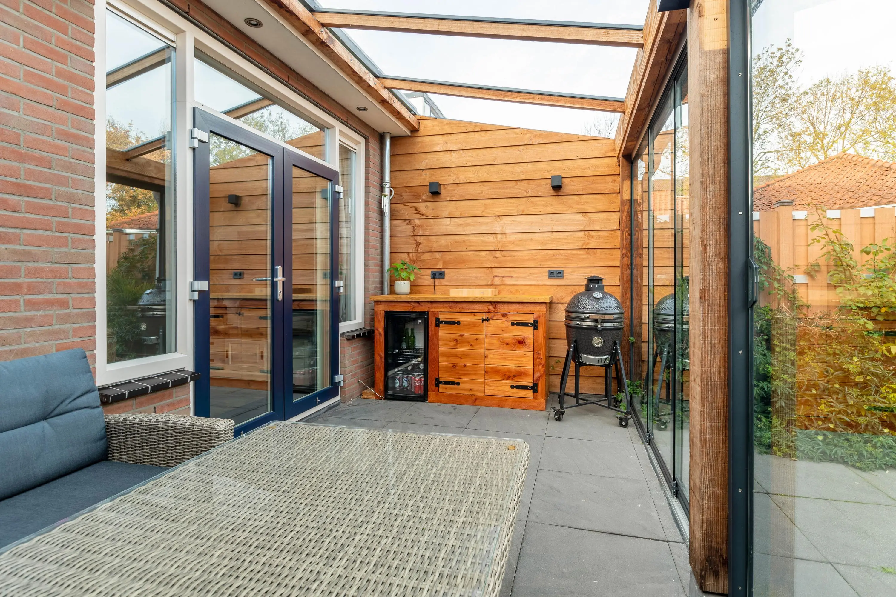 De tuin ligt op het noordoosten en is een fijne plek waar je in de ochtend van de zon kunt genieten en tijdens warme dagen de verkoelende schaduw opzoekt. Aan de achterzijde is een prachtige veranda met glazen dak geplaatst, waardoor je hier het hele jaar door beschut kunt zitten. Daarnaast is er een ruime schuur aanwezig voor extra opslag en het stallen van fietsen. Daarnaast is er ook nog een praktische achterom aanwezig.