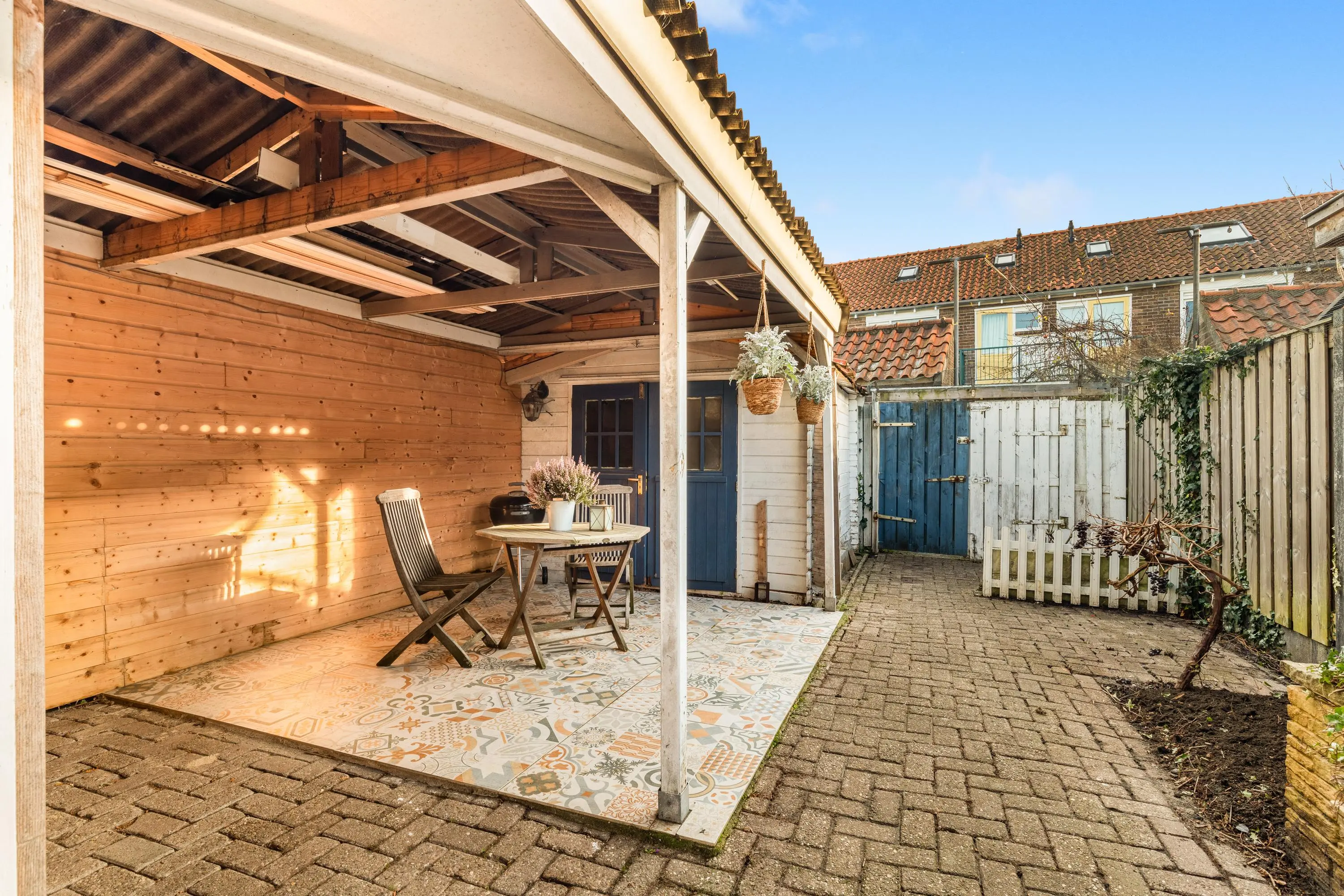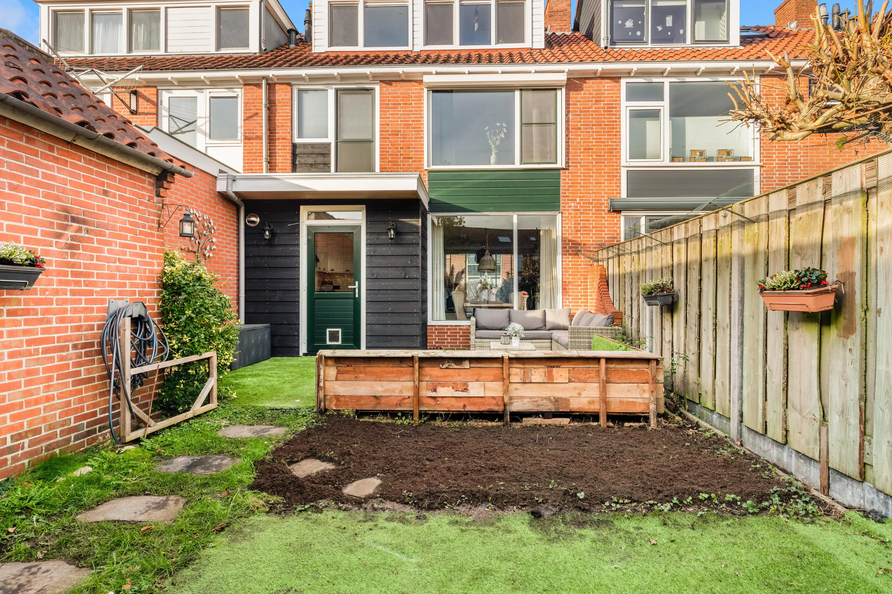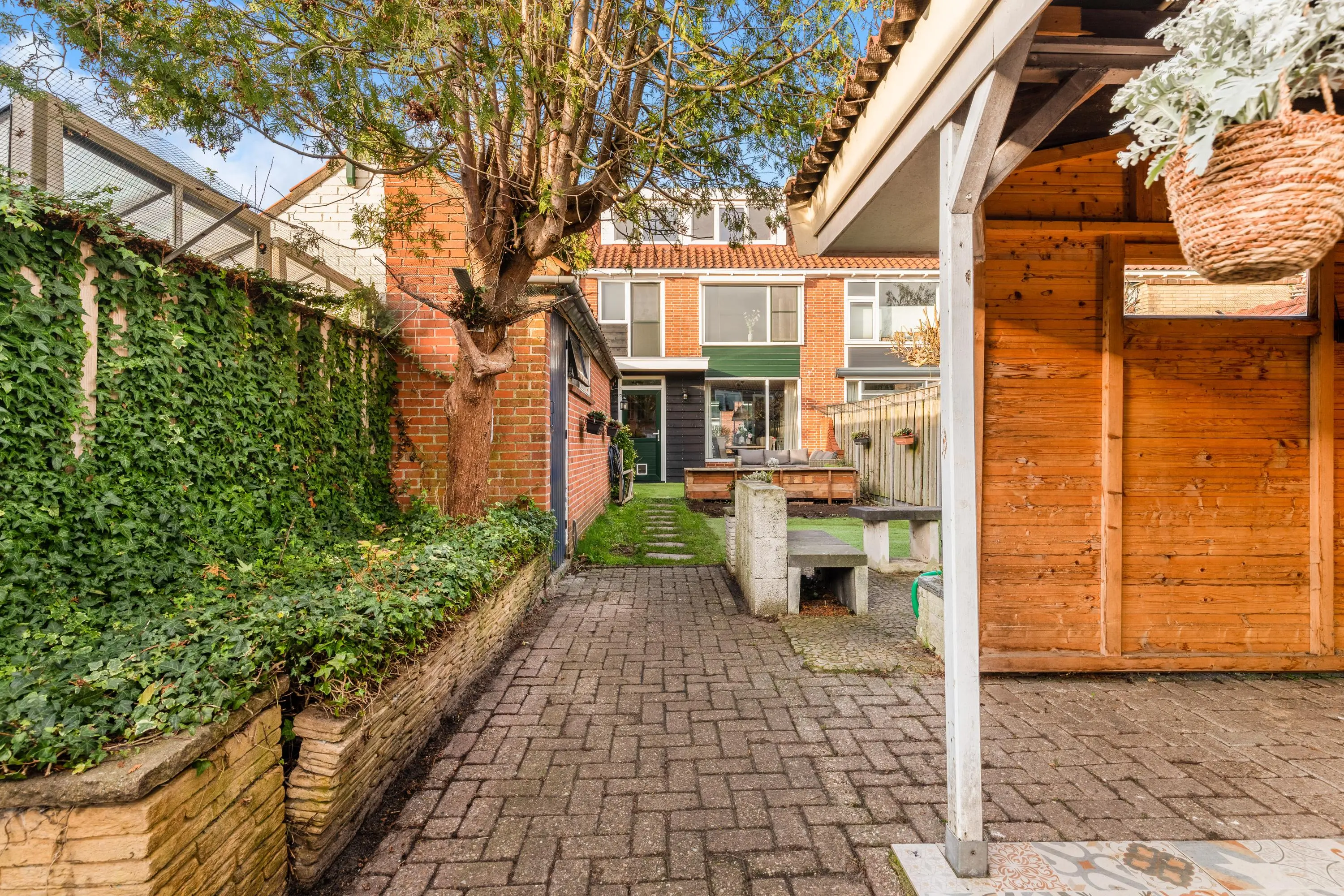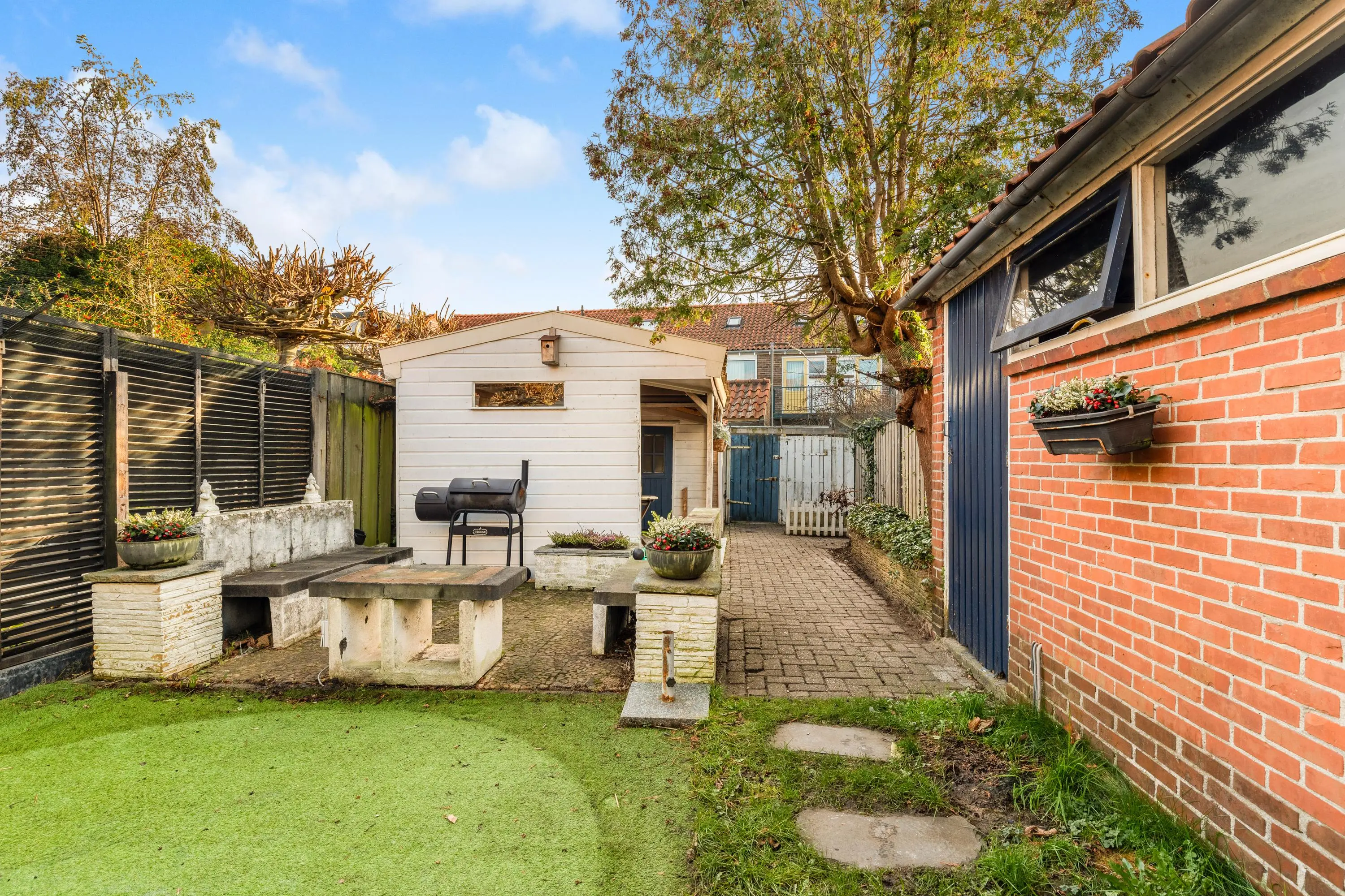 De achtertuin is ruim bemeten met schuur en veranda en nog een aparte berging. Tevens is er en achterom naar de steeg.