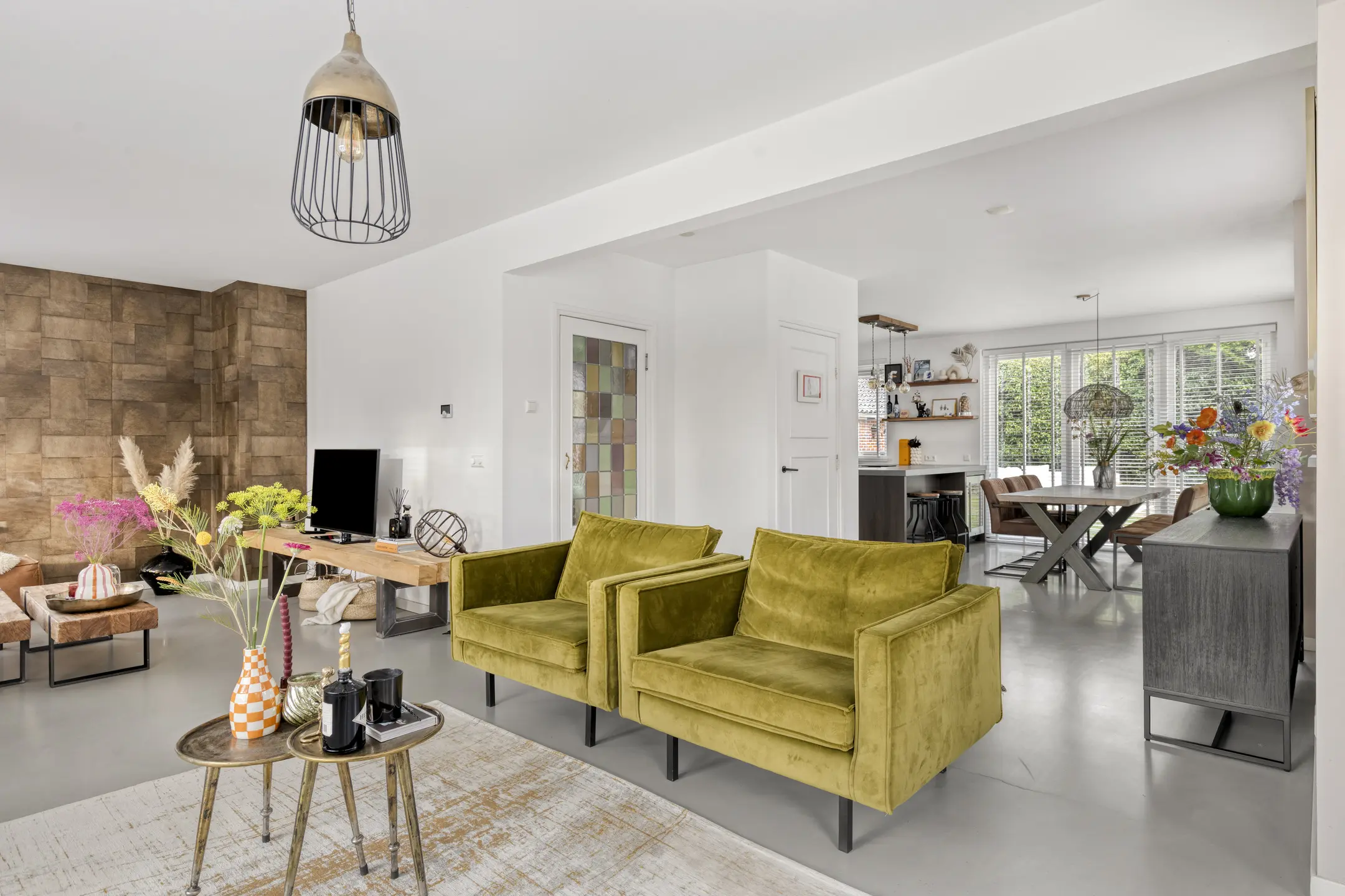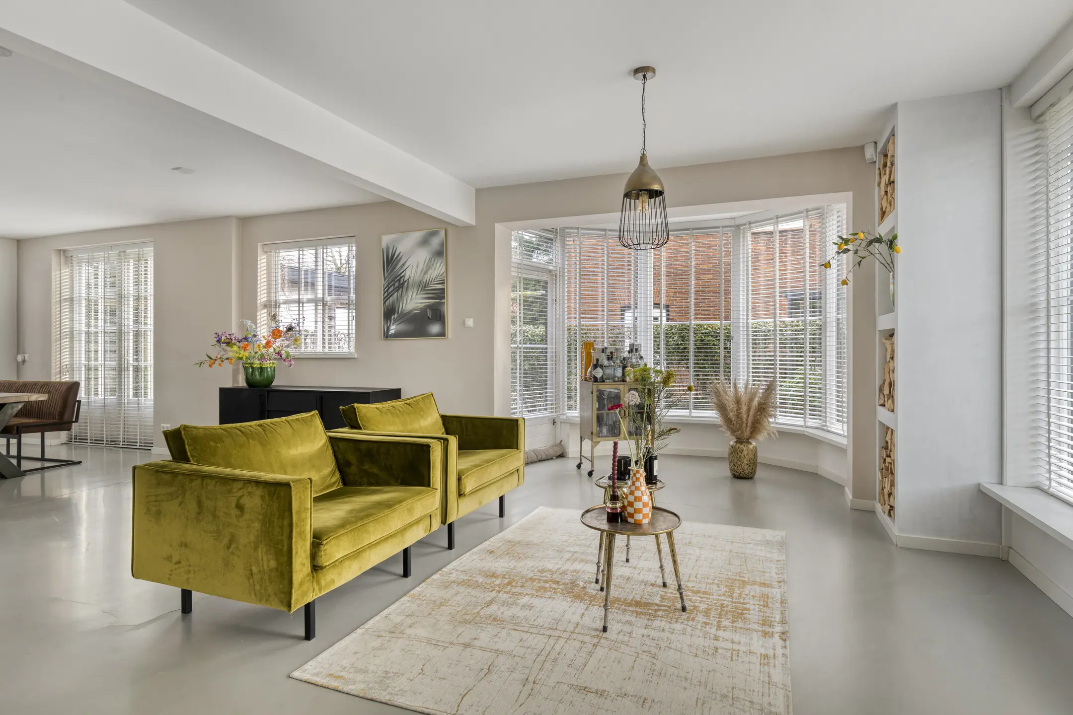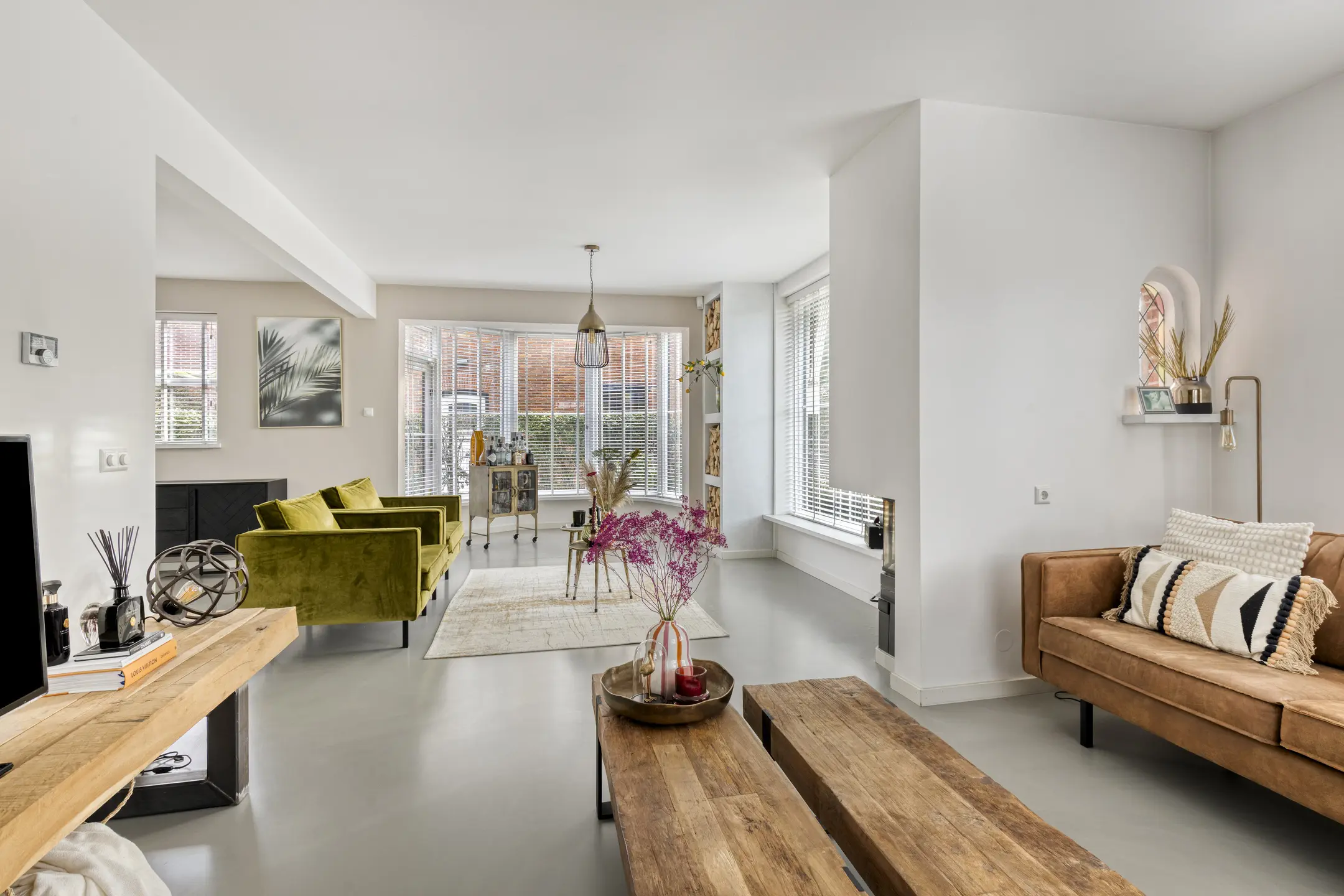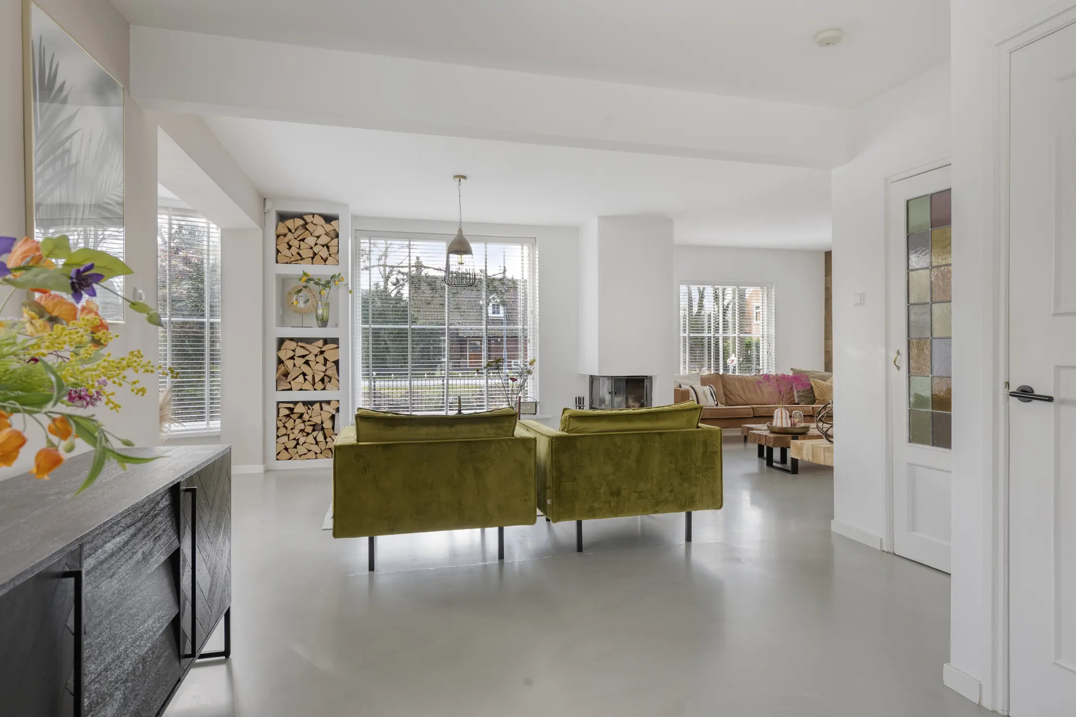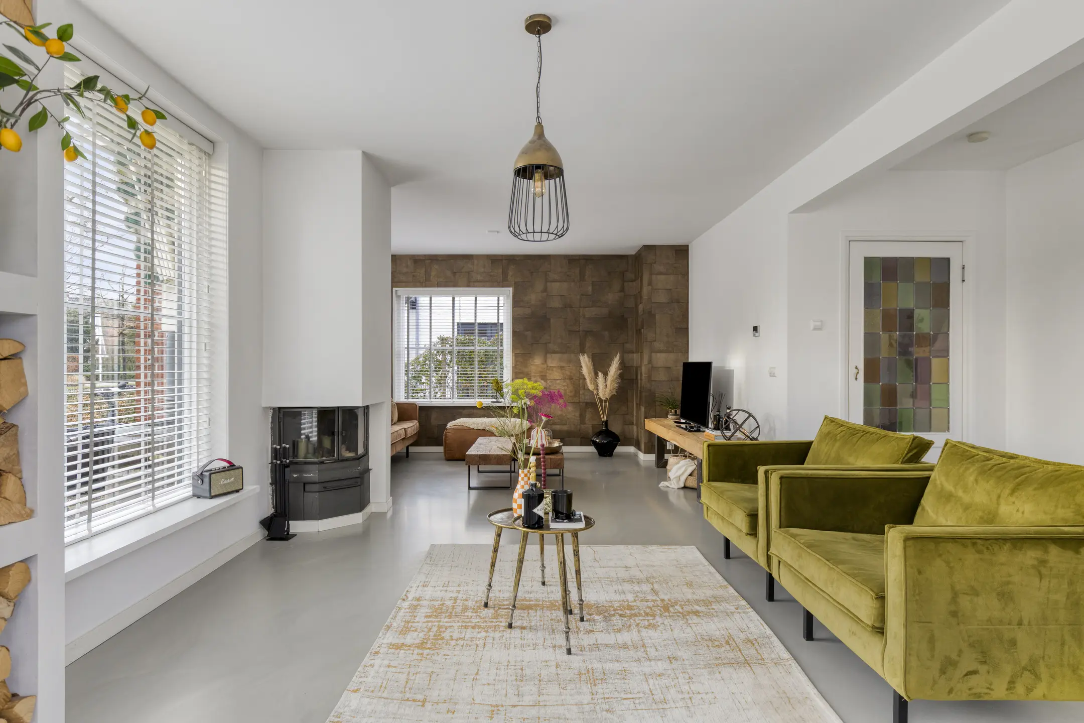 Binnen voelt de woning direct aangenaam aan. De begane grond is ruimtelijk opgezet en dankzij de vele ramen vloeit het daglicht rijkelijk naar binnen. De woonkamer is voorzien van comfortabele vloerverwarming en een gietvloer, wat bijdraagt aan het lichte en hedendaagse karakter. Aan de voorzijde bevindt zich een gezellige zithoek met open haard. In de ronde uitbouw is een extra zithoek gecreëerd, een knusse plek waar je heerlijk kunt ontspannen.