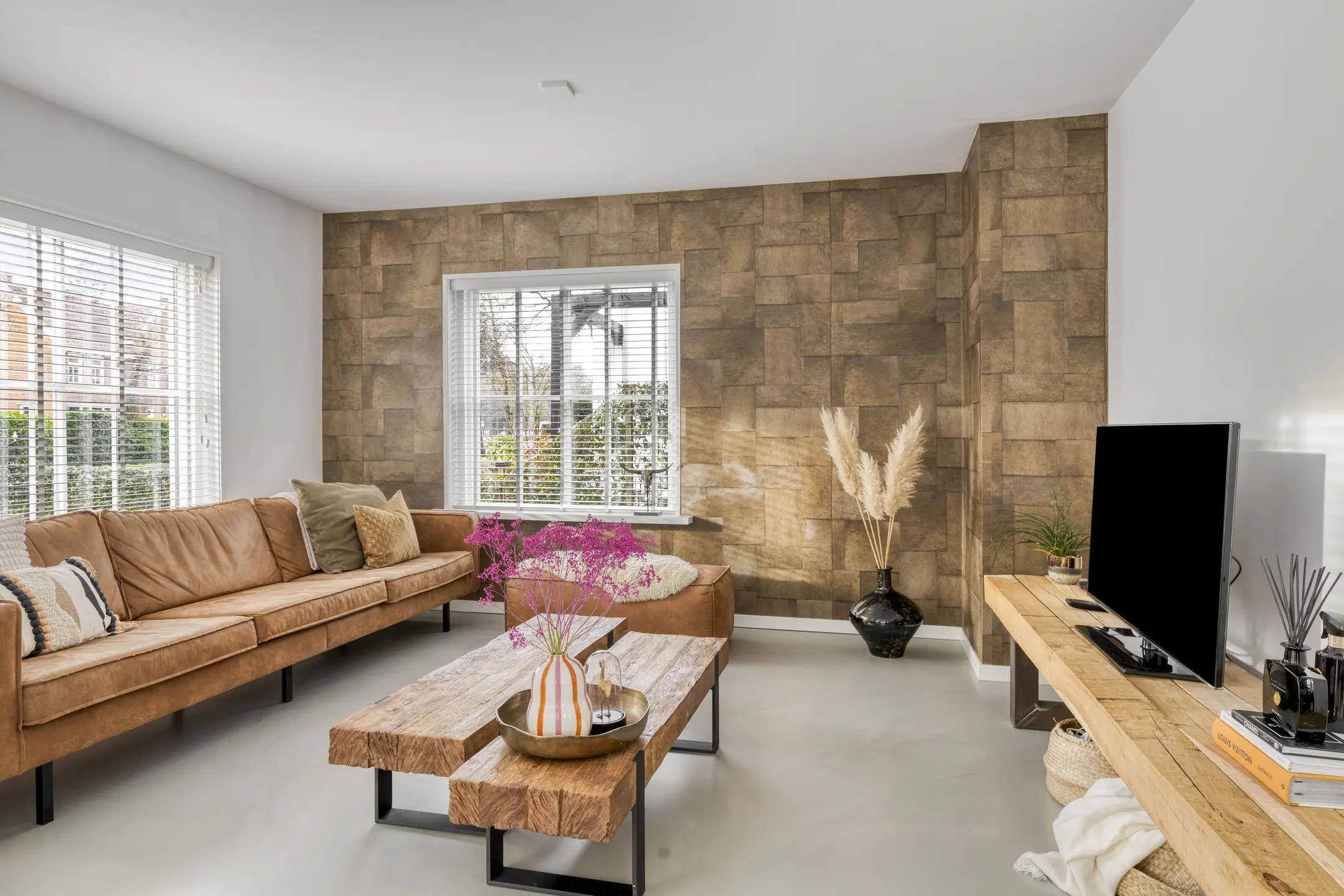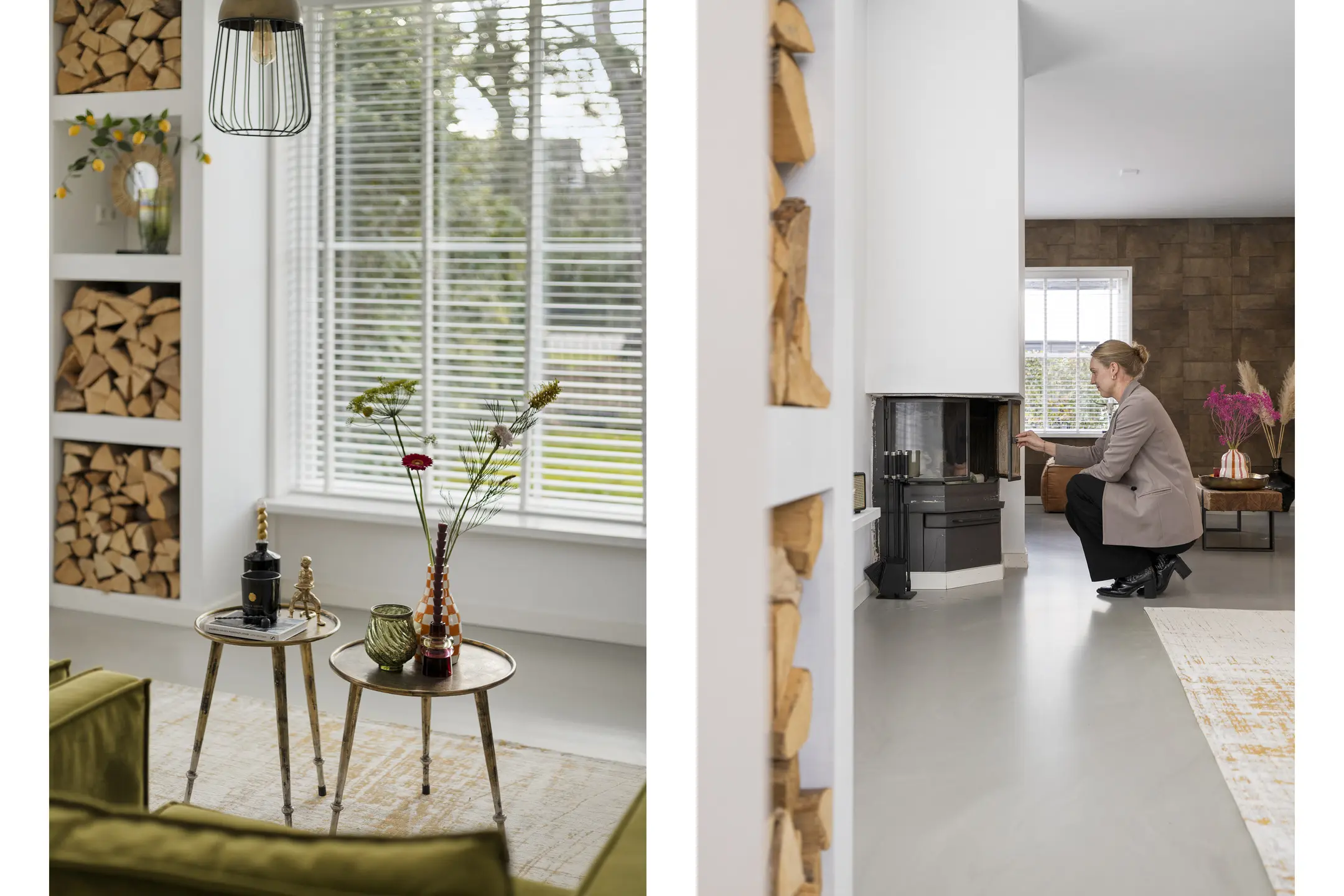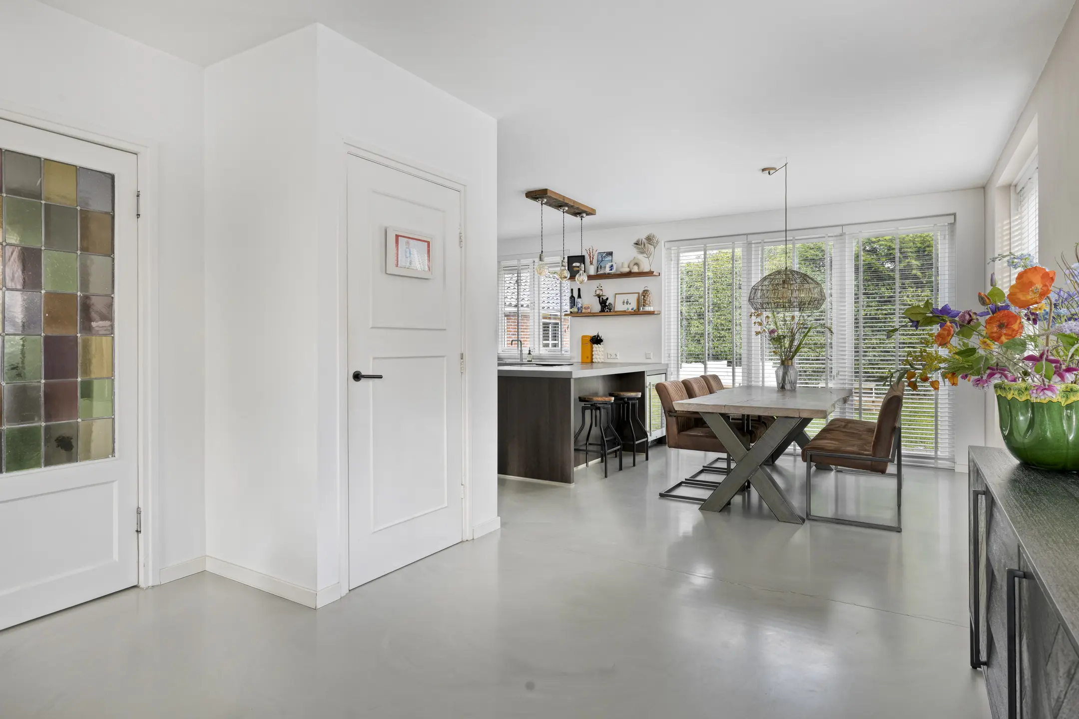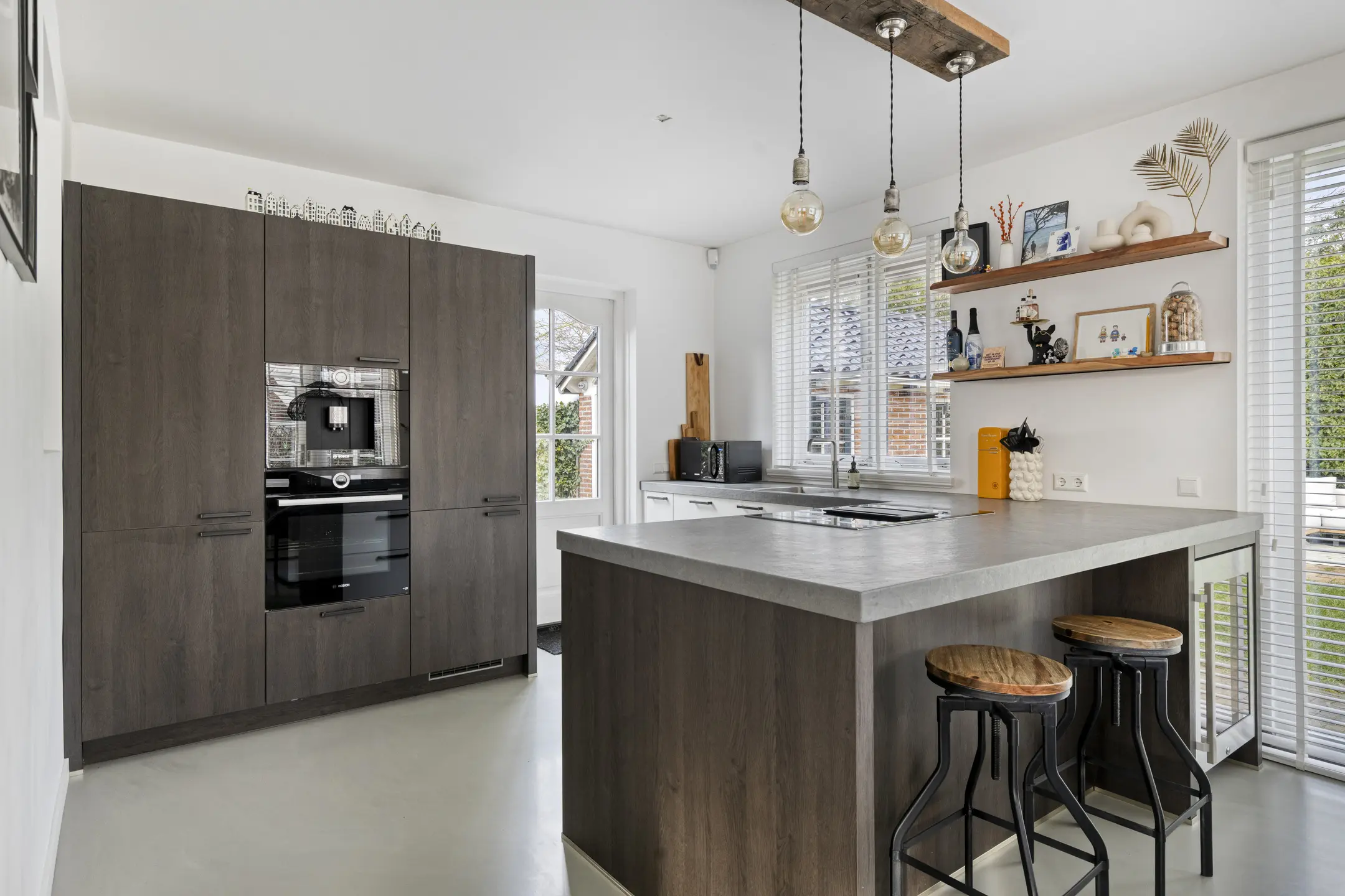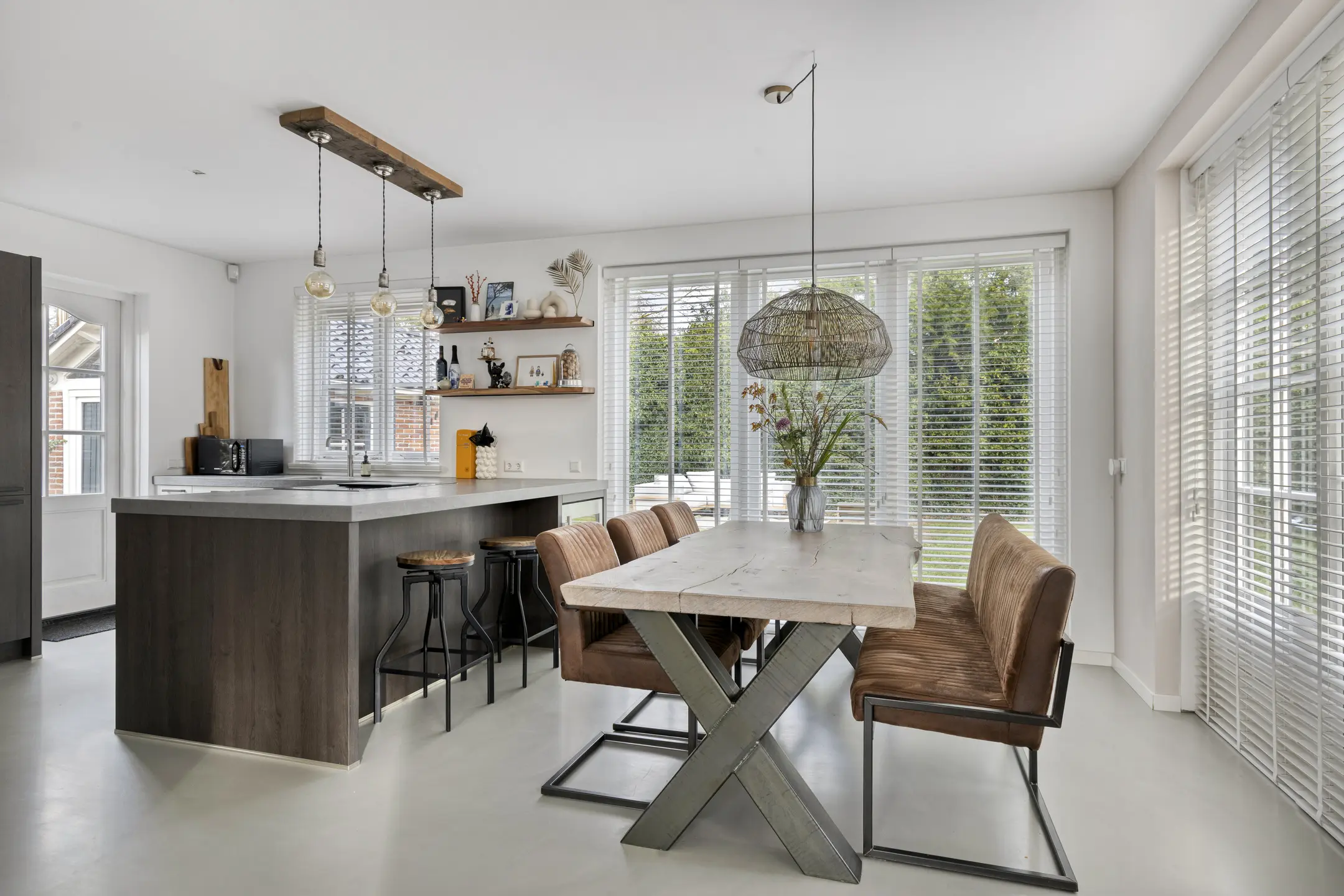 Binnen voelt de woning direct aangenaam aan. De begane grond is ruimtelijk opgezet en dankzij de vele ramen vloeit het daglicht rijkelijk naar binnen. De woonkamer is voorzien van comfortabele vloerverwarming en een gietvloer, wat bijdraagt aan het lichte en hedendaagse karakter. Aan de voorzijde bevindt zich een gezellige zithoek met open haard. In de ronde uitbouw is een extra zithoek gecreëerd, een knusse plek waar je heerlijk kunt ontspannen.