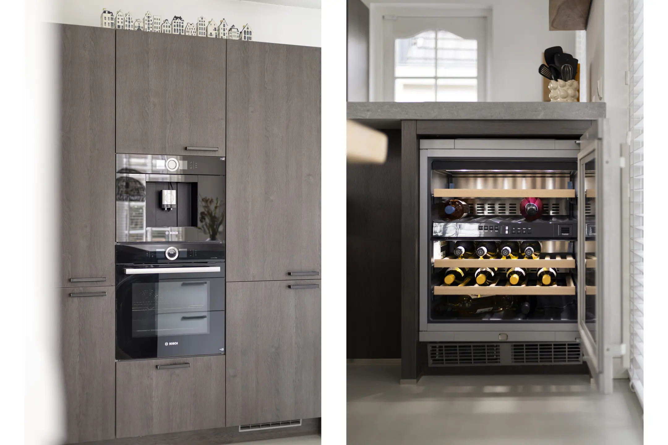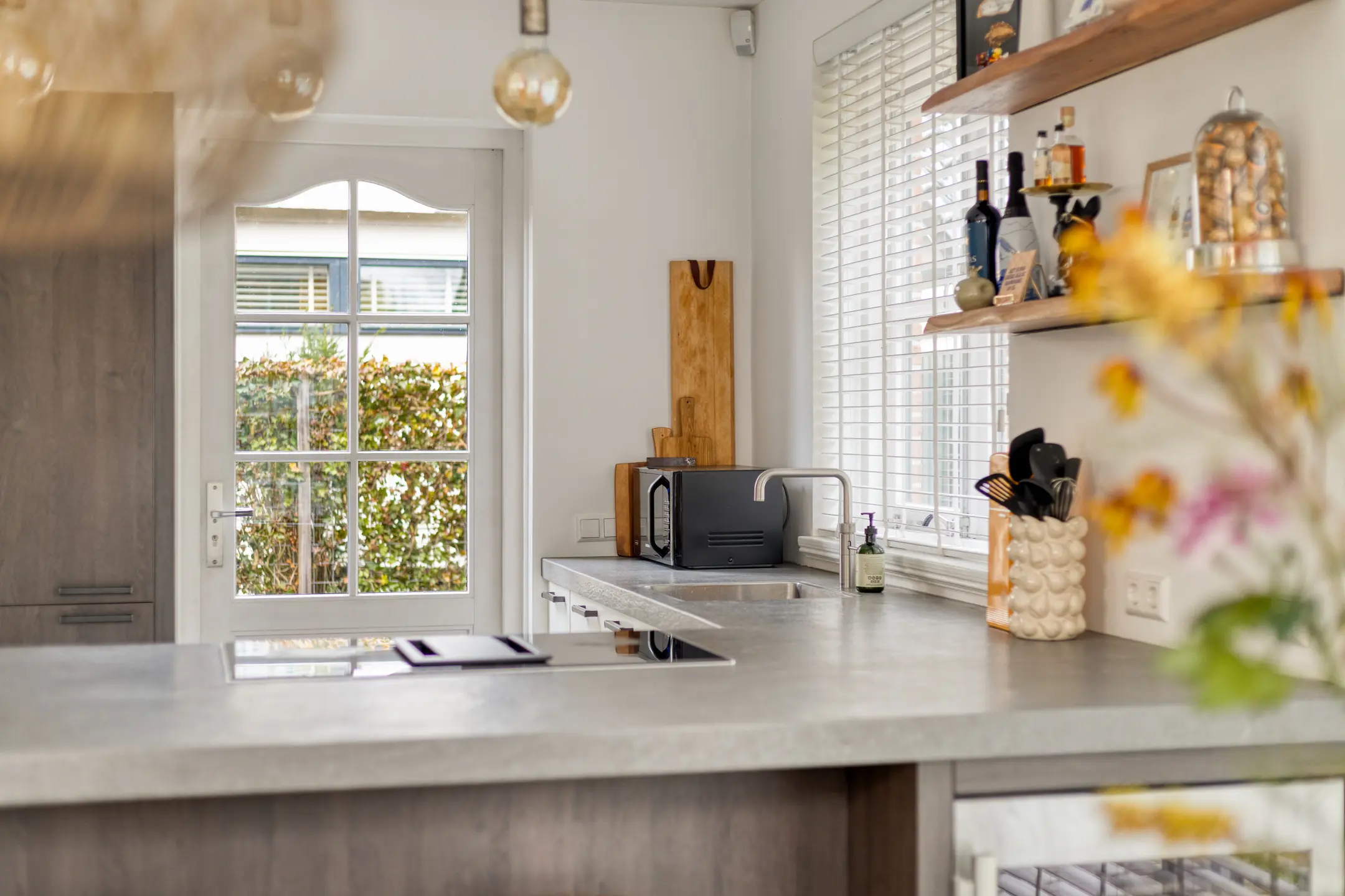 Aan de achterzijde van de woning bevindt zich de eethoek met de moderne keuken. Deze in 2018 geplaatste keuken is stijlvol uitgevoerd, voorzien van diverse inbouwapparatuur en veel werkblad- en kastruimte. Vanuit de eethoek geven openslaande deuren toegang tot de tuin op het zuidoosten, die naadloos overloopt in de achtertuin op het noordoosten. Hier zit je heerlijk beschut en privé dankzij de groenblijvende haag.